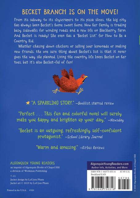But Becket is ready! She even makes her own “Becket List” for How to Be a Country Kid. Things don’t always work out the way she planned, but whether it’s selling mouth-puckering lemonade, feeding hostile hens, or trying to make a new best friend, Becket is determined to use her city smarts to get a grip on country living.