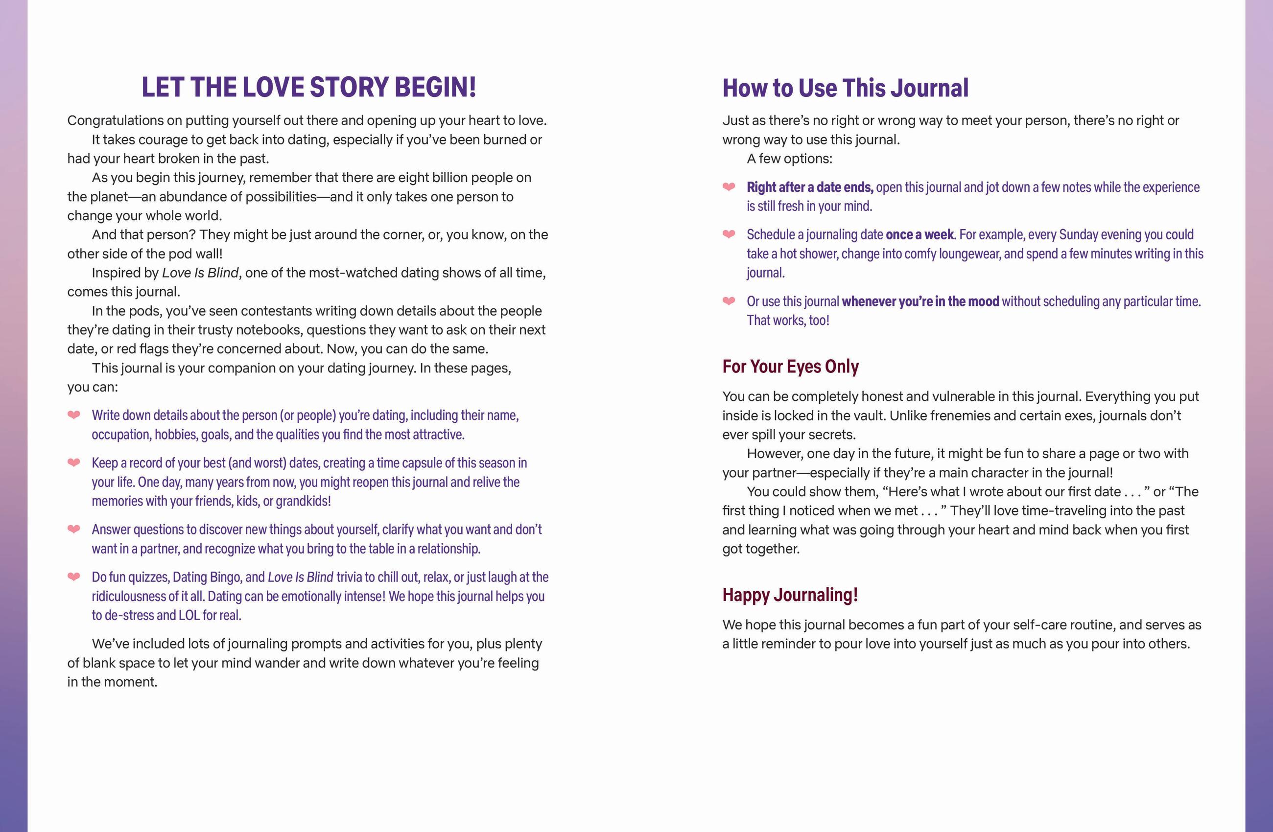There may be over eight billion people on the planet, but there’s a perfect partner for everyone out there—this journal can provide support for anyone on the search for that special someone.