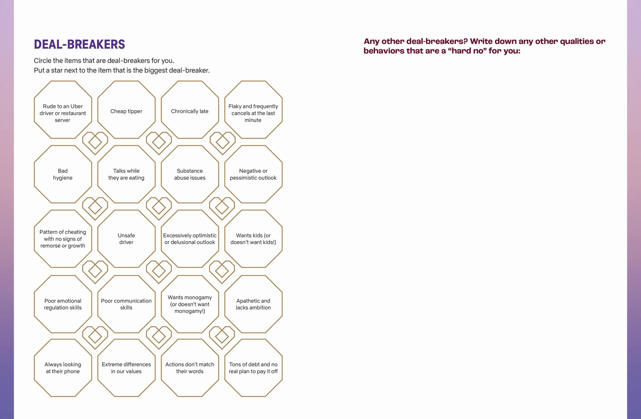 - Answer questions to discover new things about themselves, clarify what they want and don’t want in a partner, and what they bring to the table in a relationship.