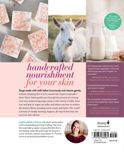 “Milk Soaps is more than a “how to” soapmaking book. It's a motivational magazine-style manual for everyone who loves to create. Whether you are new to soapmaking, or you've been at it for a while, the techniques and artistry revealed within these pages will immediately inspire you to action. Not only will you learn how just about every kind of milk (yes, even breast milk!) imaginable performs in soap, you'll also discover how to incorporate it properly to create a perfect bar every time. Easy to follow “beginner,” “intermediate,” and “advanced” sections make it easy for you to quickly choose a recipe and get started right away. With Anne-Marie as your guide, not only will you make awesome soap, but you'll be inspired to enlarge the creativity quotient in all aspects of your life. Buy this book now!” —Donna Maria, founder and CEO, IndieBusinessNetwork.com and DonnaMaria.com.