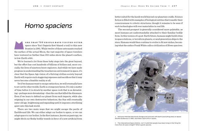Each chapter is filled with bite-sized explainers and longer sections on meatier topics such as habitable zones, xenolinguistics, and UFO religions. Smaller topics include alien abductions, ancient astronauts, exodinosaurs, Project Cyclops, and the Great Moon Hoax.