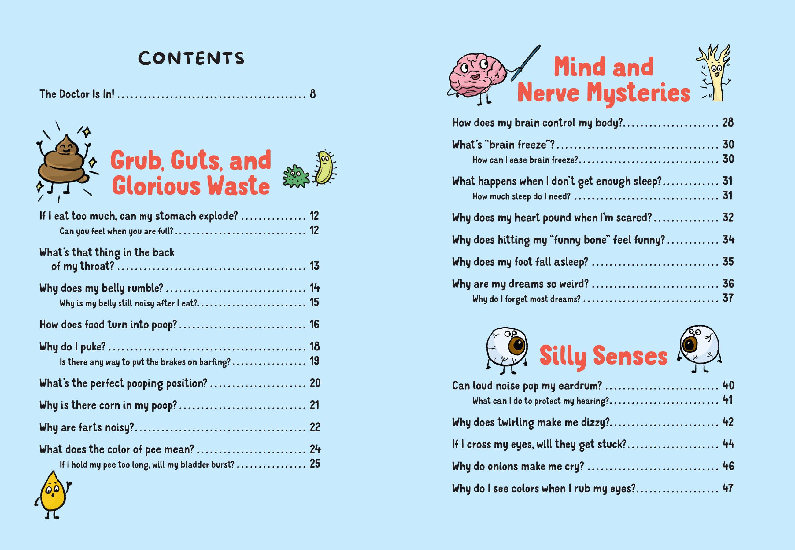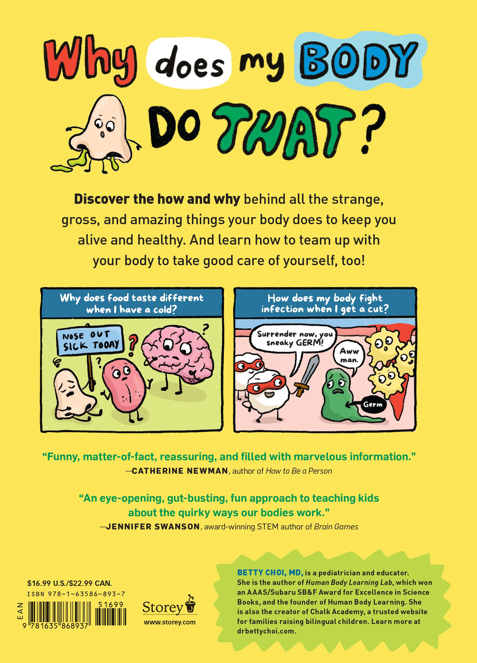 What do the colors of my boogers mean when I have a cold? If I hold my pee too long, could my bladder explode? Why do bruises change color? Kids have so many pressing questions about the stuff their bodies do and what happens when they’re sick. Pediatrician Betty Choi gives honest answers to 53 curious questions in this kid-friendly Q&A, with easy-to-follow, fun comics by illustrator Jannie Ho. Topics range from “Grub, Guts, and Glorious Waste” to “Silly Senses” and “Coughs, Colds, and Conundrums.” In the process, Dr. Choi shows kids how amazing and resilient their bodies really are and that doctors are here to help.
