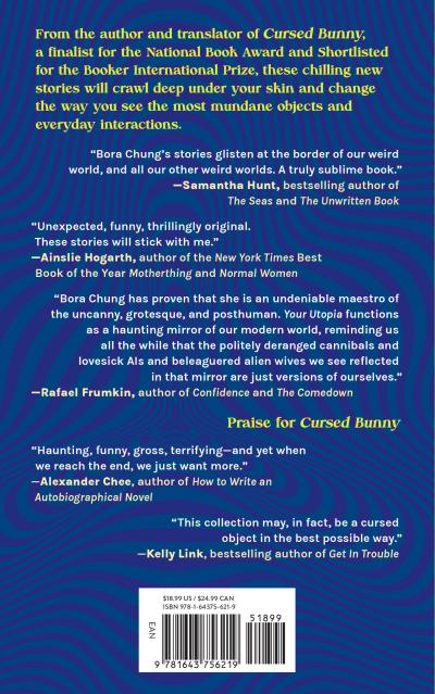 “Fans of Korean author Bora Chung’s strangely fantastic and weirdly dystopian—sometimes horrific—tales are in for a treat…Your Utopia will leave readers uncomfortable yet yearning for more. Thought-provoking and bound to take readers through a wild ride of emotions and experiences.”International Examiner