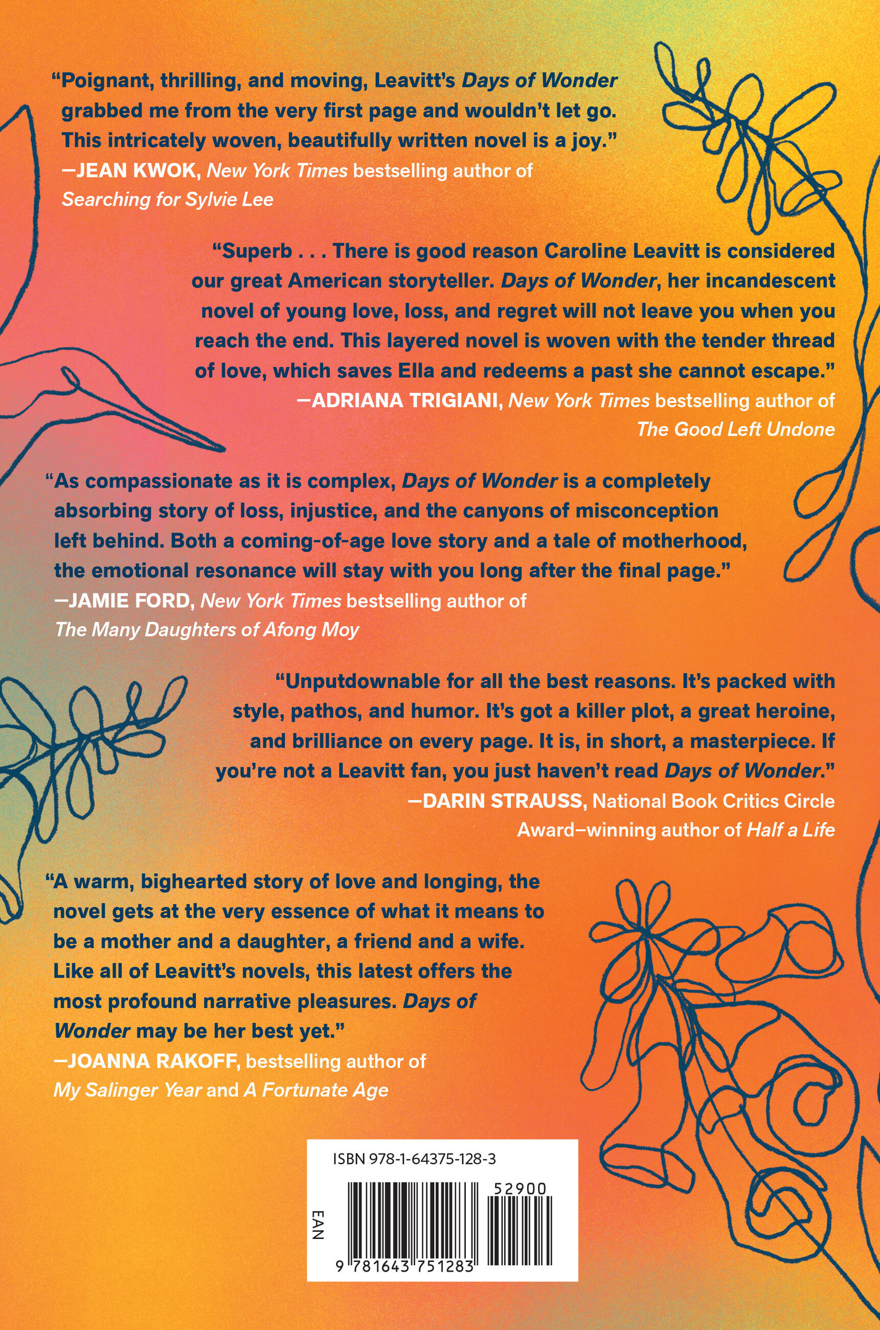 "There is good reason Caroline Leavitt is considered our great American storyteller. Days of Wonder, her incandescent novel of young love, loss and regret will not leave you when you reach the end. Ella Fitchburg is a total original, her struggles for truth, connection and forgiveness are our own. This layered novel is woven with the tender thread of love, which saves Ella and redeems a past she cannot escape. Superb."Adriana Trigiani, New York Times bestselling author of The Good Left Undone