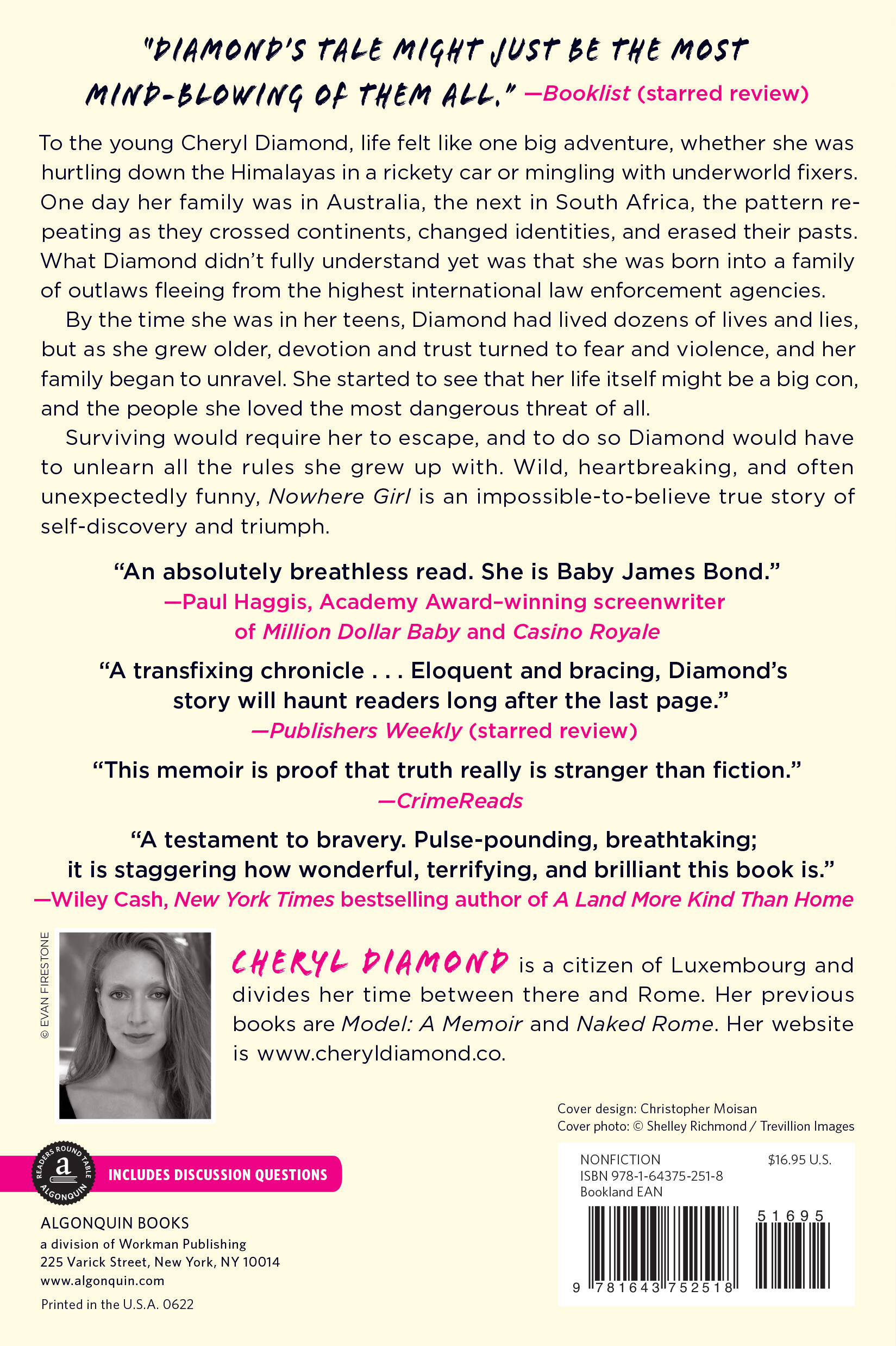 “Former teen model Diamond reveals a childhood both wacky and cliff-hanging in Nowhere Girl; on the run with an outlaw family, she lived in more than a dozen countries, on five continents, under six assumed identities, by age nine.”