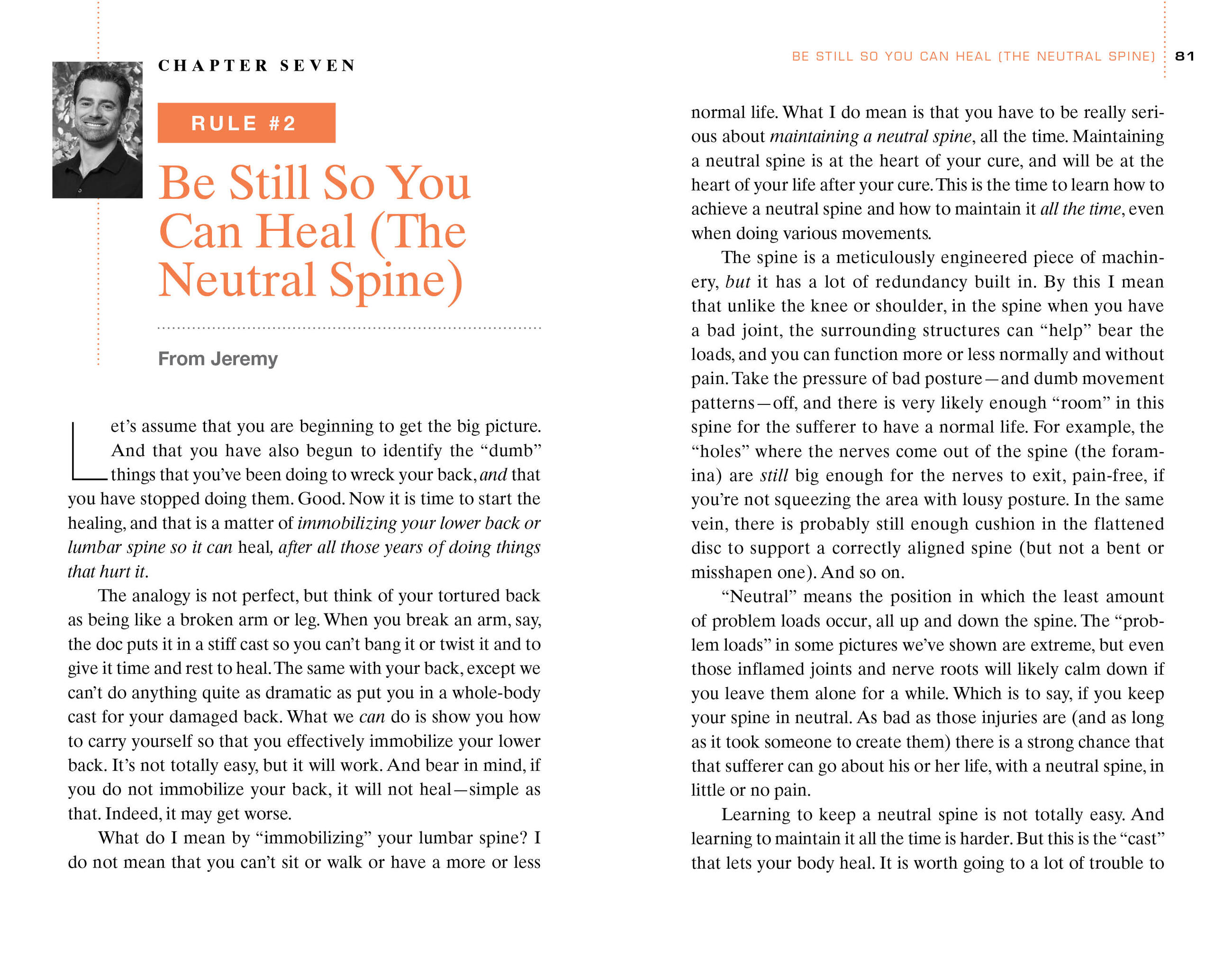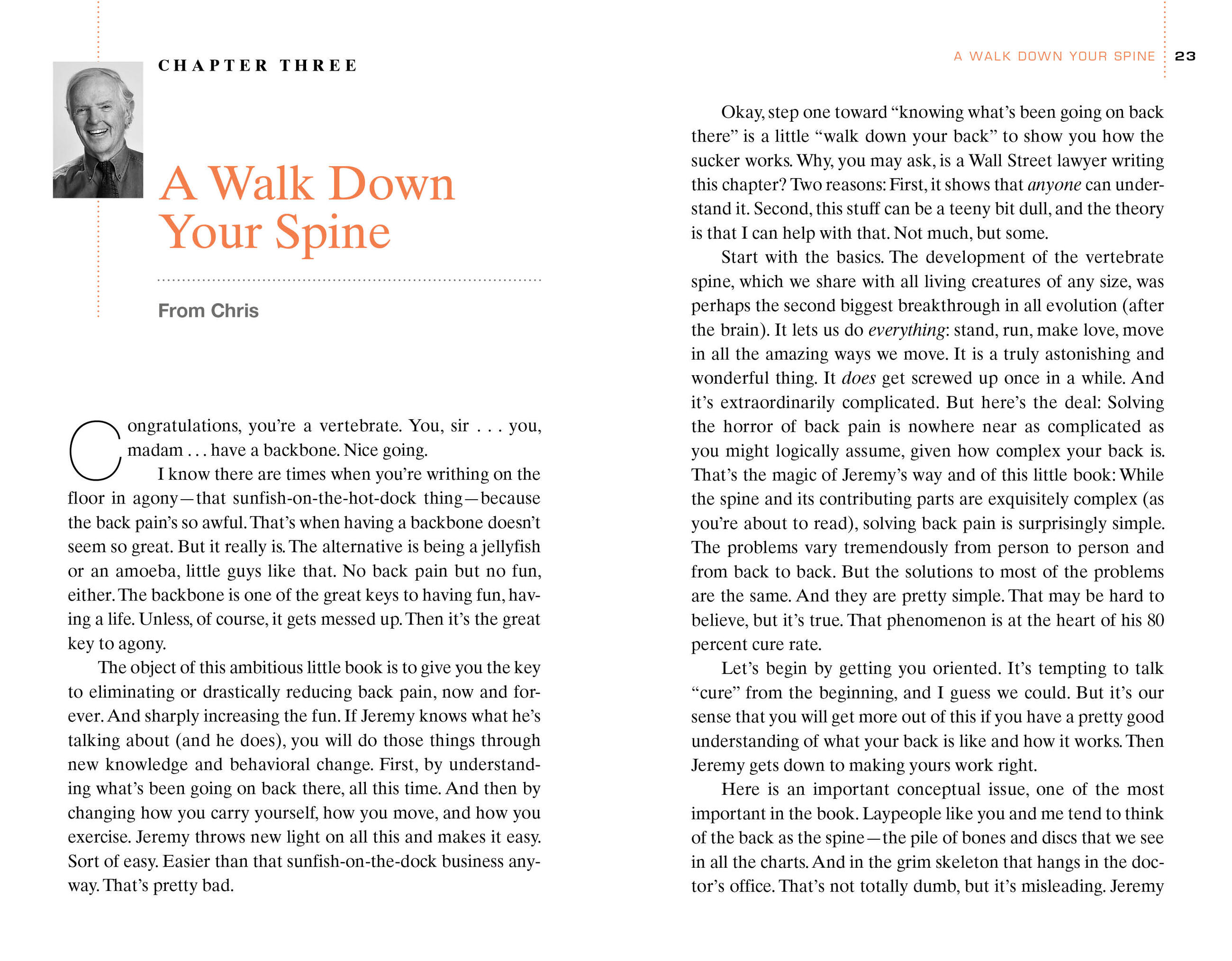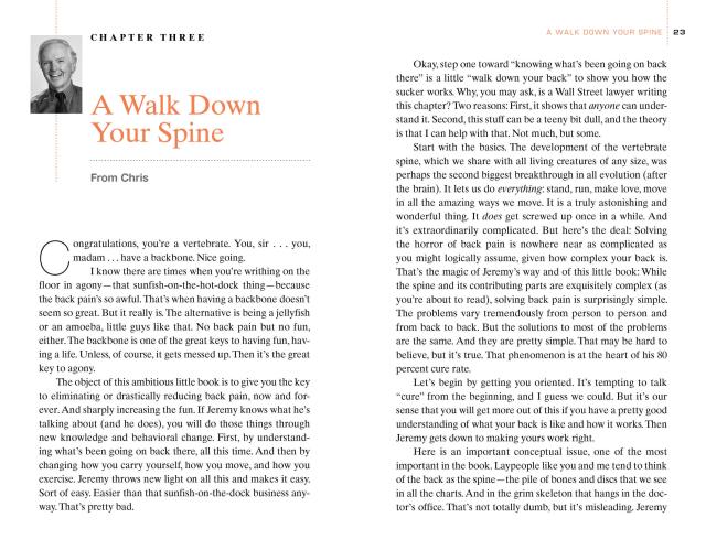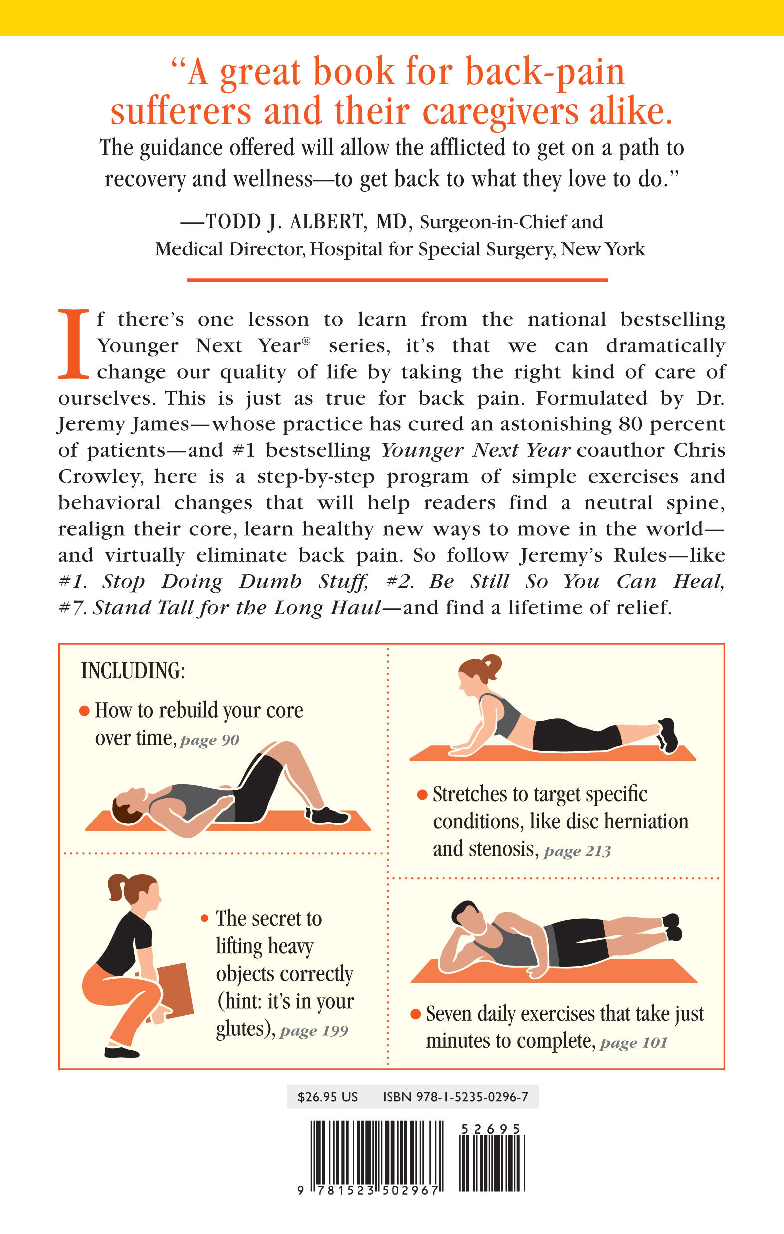 If there’s one lesson to learn from the national bestselling Younger Next Year series, it’s that we can dramatically change our quality of life by taking the right kind of care of ourselves. This is just as true for back pain. Formulated by Dr. Jeremy James—whose practice has cured an astonishing 80% of patients—and #1 bestselling Younger Next Year coauthor Chris Crowley, here is a step-by-step program of simple exercises and behavioral changes that will help readers find a neutral spine, realign their core, learn healthy new ways to move in the world—and virtually eliminate back pain. So follow Jeremy’s rules—like #1. Stop Doing Dumb Stuff, #2. Be Still So You Can Heal, #7. Stand Tall for the Long Hail—and find a lifetime of relief.