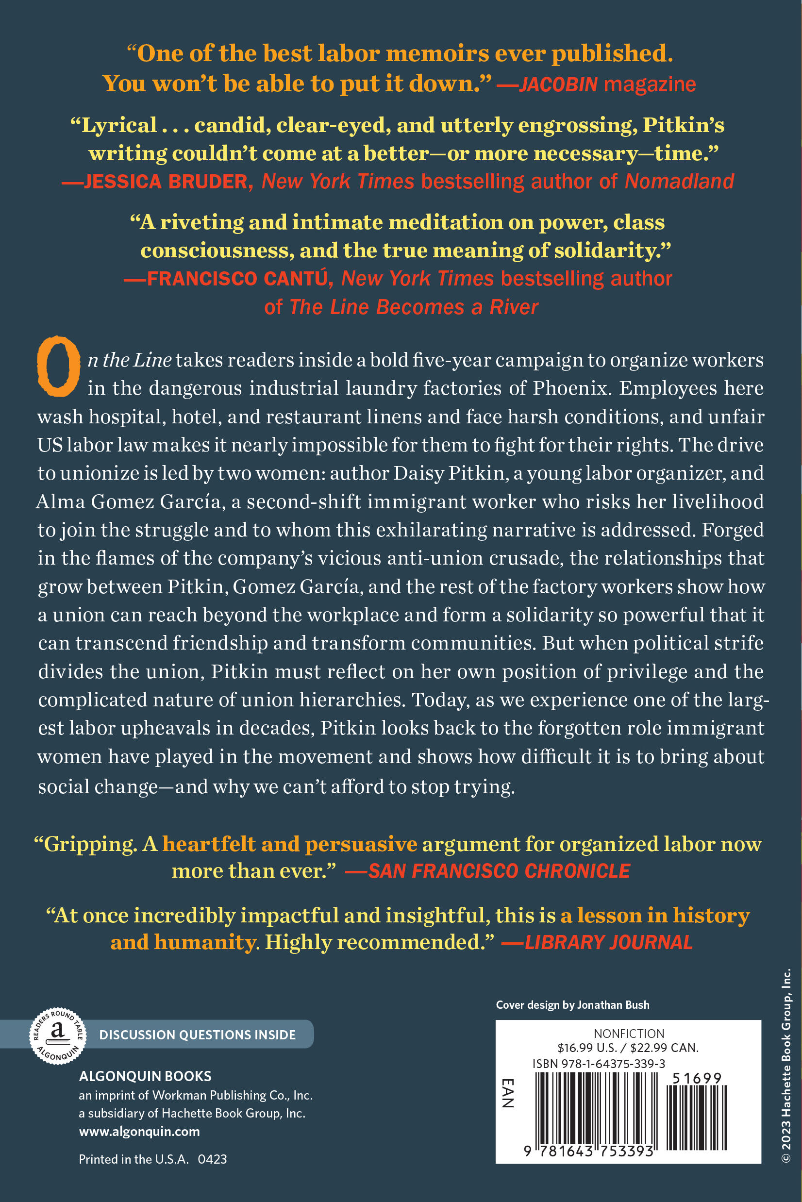 On the Line takes readers inside a bold five-year campaign to organize workers in the dangerous industrial laundry factories of Phoenix, Arizona. Employees here wash hospital, hotel, and restaurant linens and face harsh conditions, and unfair U.S. labor law makes it nearly impossible for them to fight for their rights. The drive to unionize is led by two women: author Daisy Pitkin, a young labor organizer, who addresses this exhilarating narrative to Alma Gomez García, a second-shift immigrant worker, who risks her livelihood to join the struggle. Forged in the flames of the company’s vicious anti-union crusade, the relationships that grow between Daisy, Alma, and the rest of the factory workers show how a union can reach beyond the workplace and form a solidarity so powerful that it can transcend friendship and transform communities. But when political strife divides the union, Daisy must reflect on her own position of privilege and the complicated nature of union hierarchies. Daisy Pitkin also looks back to the forgotten role immigrant women have played in the labor movement, as we experience one of the largest labor upheavals in decades, she shows how difficult it is to bring about social change, and why we can’t afford to stop trying.