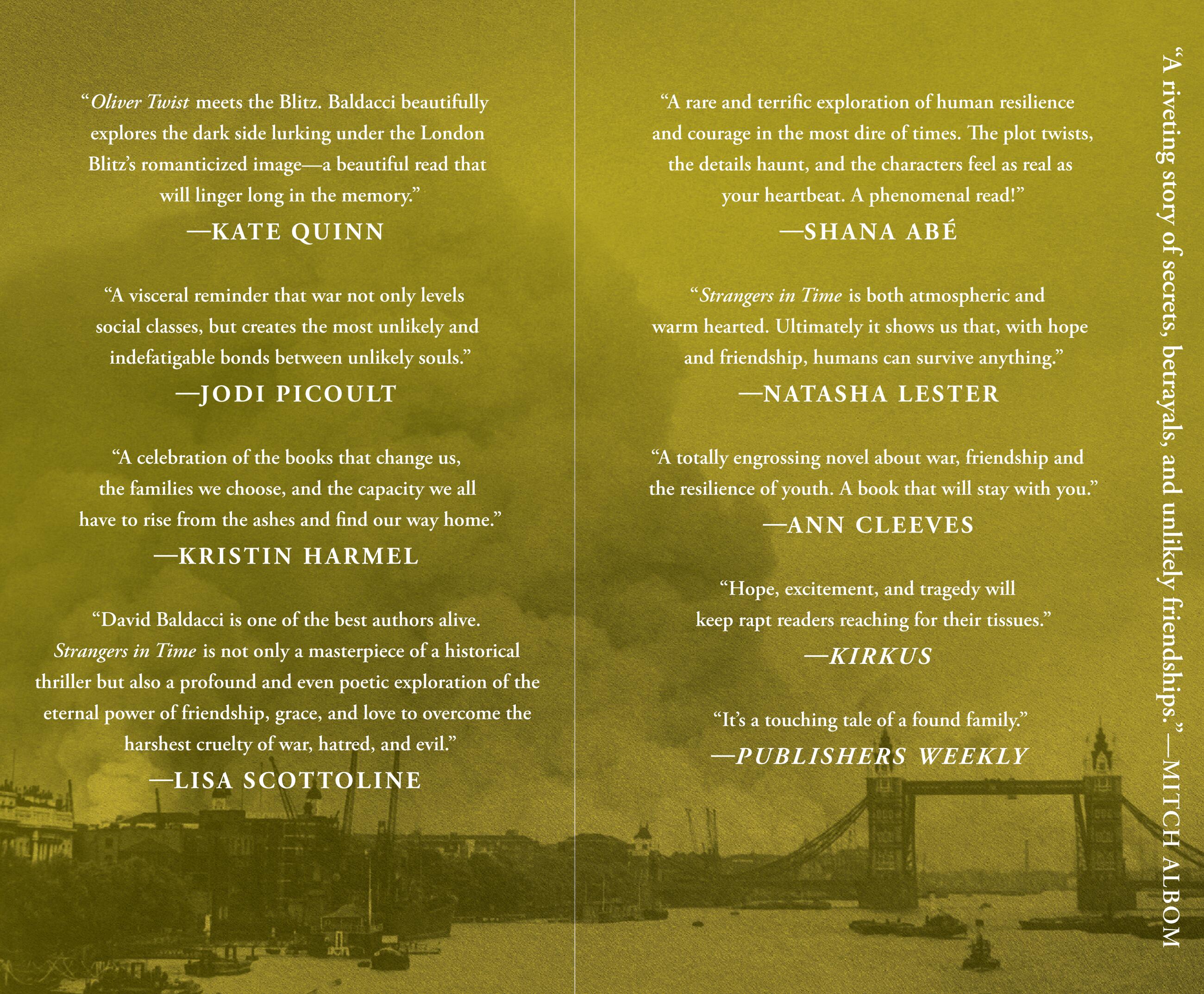“David Baldacci has the audacity to cross boundaries and genres with Strangers in Time, and he does so with aplomb. A rare and terrific exploration of human resilience and courage in the most dire of times, Baldacci drops the reader straight into the shattered remains of London near the end of World War II. Three wildly different but completely wonderful heroes gradually end up forging a friendship that survives on grit, hope, and sacrifice. The plot twists, the details haunt, and the characters feel as real as your heartbeat. I stayed up all night to finish it. A phenomenal read!”Shana Abé, New York Times bestselling author