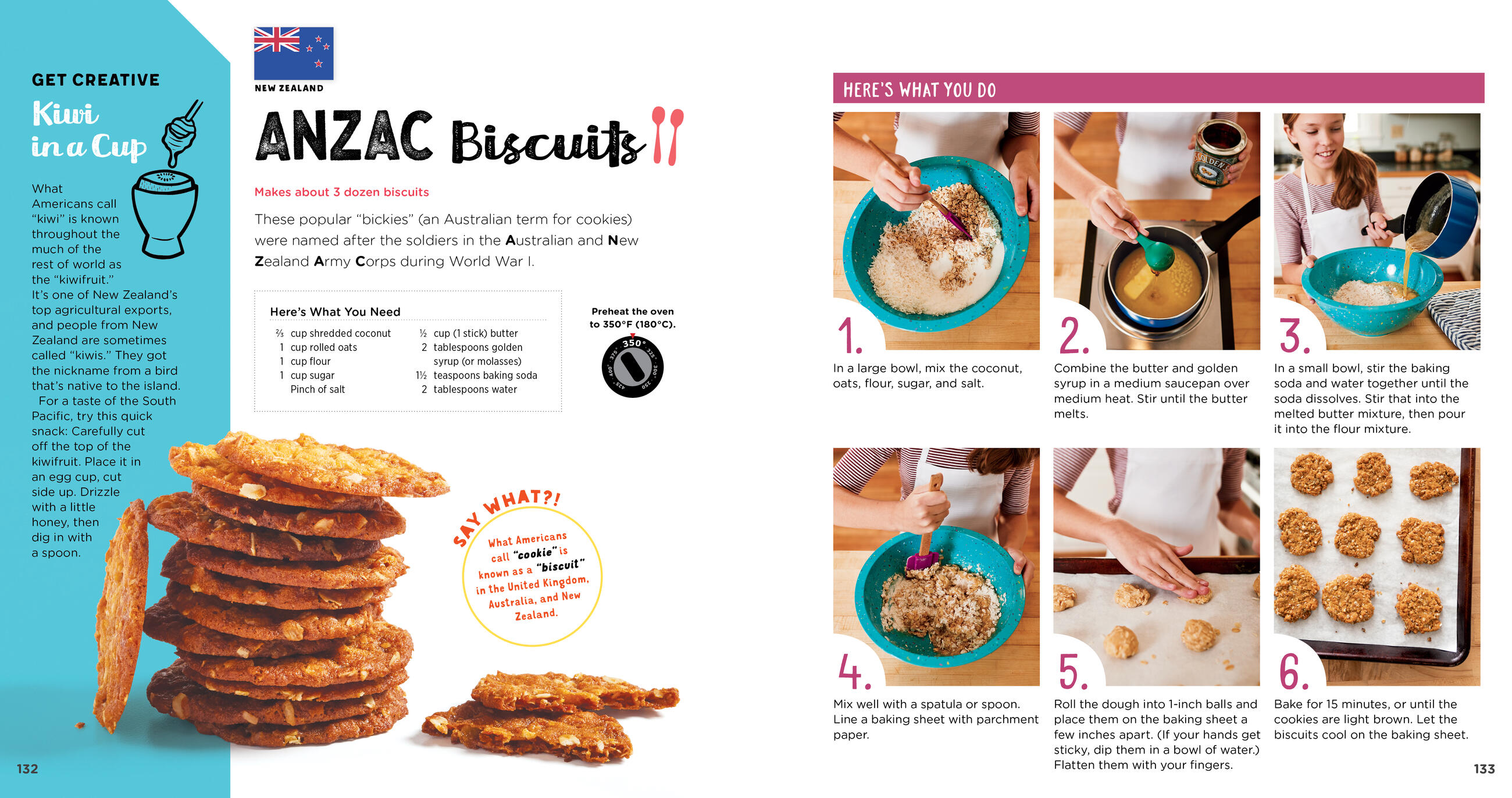 “An international cast of kids takes young readers on a culinary world tour. Recipes for ANZAC biscuits, from Australia and New Zealand, and mango lassi, from India, are enhanced by language flashcards and flag stickers.” — Publisher’s Weekly