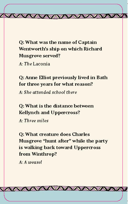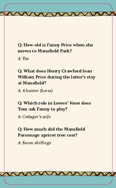 - Categories: The questions cover Sense and Sensibility, Pride and Prejudice, Mansfield Park, Emma, Northanger Abbey, and Persuasion—as well as lesser-known details about Austen’s personal life and esteemed literary career