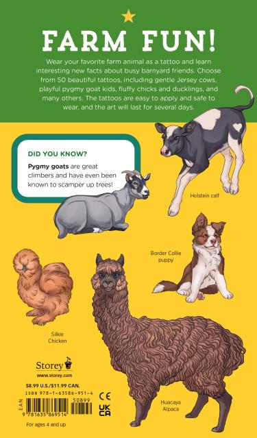 From horses and cows to chickens, geese, and more, these 50 temporary tattoos feature realistic illustrations and fun facts about each farm animal.