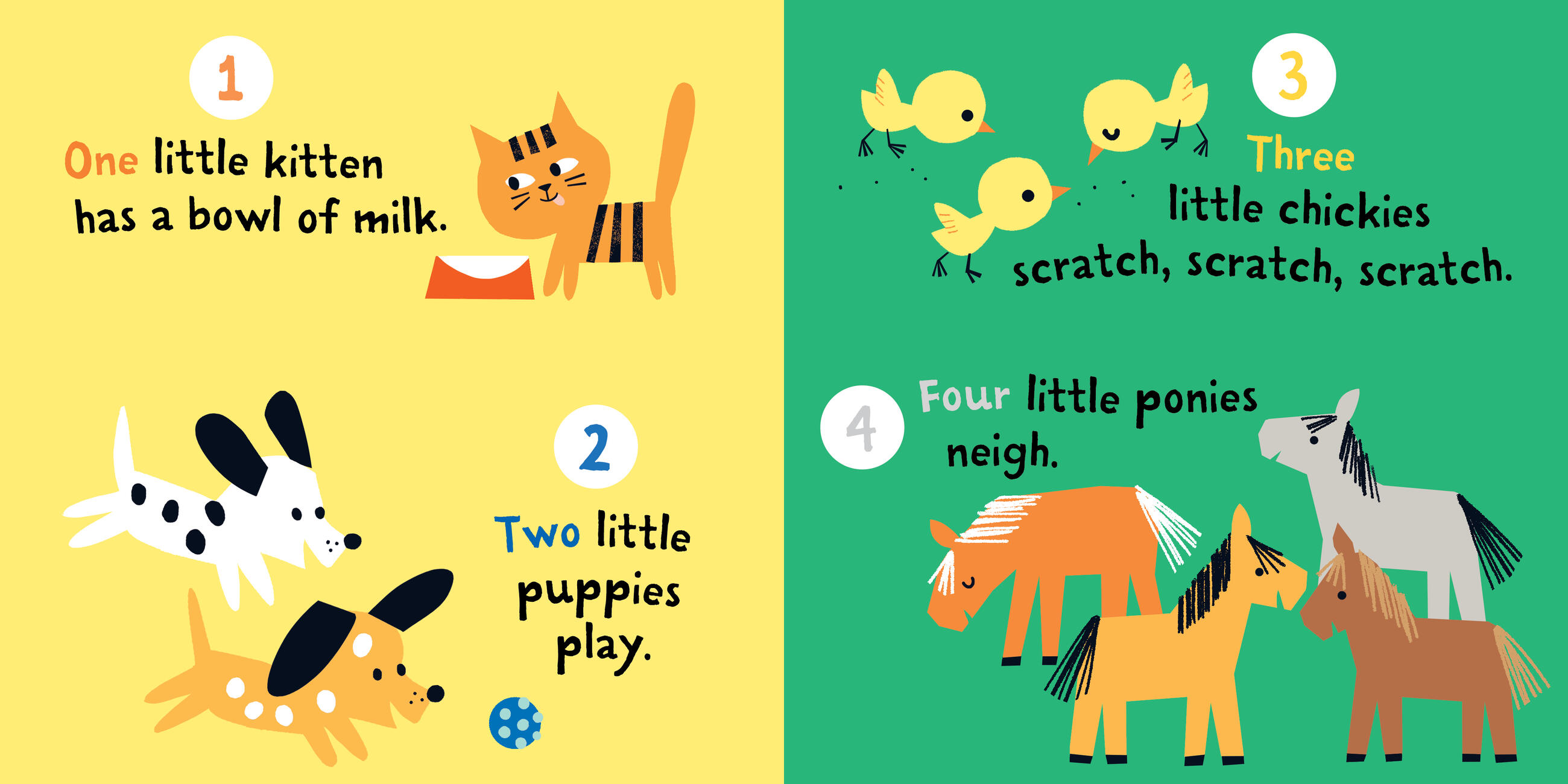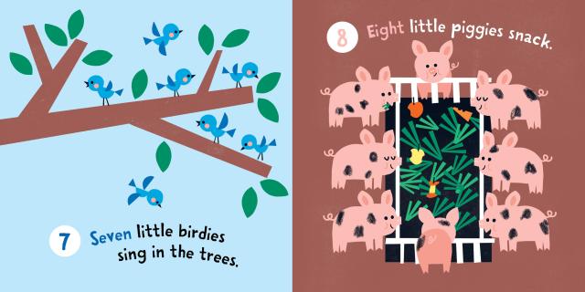 Find the numbers and say the rhyme—all the way up way up to ten! Count the animals—one, two, three! See how many ponies neigh and how many puppies play!