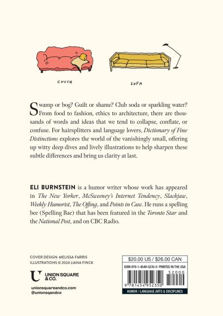 What’s the difference between mazes and labyrinths? Proverbs and adages? Clementines and tangerines? Join author Eli Burnstein on a hairsplitter’s odyssey into the world of the ultra-subtle with Dictionary of Fine Distinctions. Illustrated by New Yorker cartoonist Liana Finck, this humorous dictionary takes a neurotic, brain-tickling plunge into the infinite (and infinitesimal) nuances that make up our world.