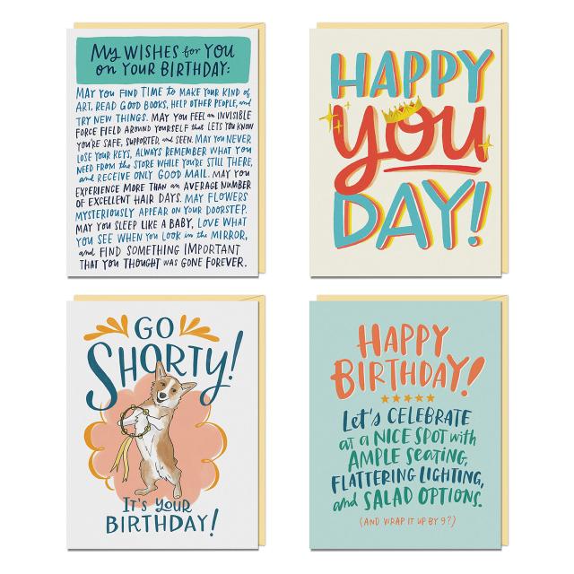 - Includes 4 heartfelt, celebratory, funny birthday card designs