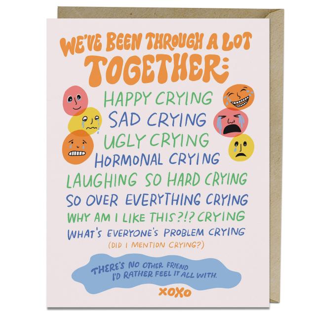 We love this card. It was written for all the beautiful criers out there, shedding tears sometimes for no known reason… We see you. We get you. We are you. We honor you with this emotional greeting card.