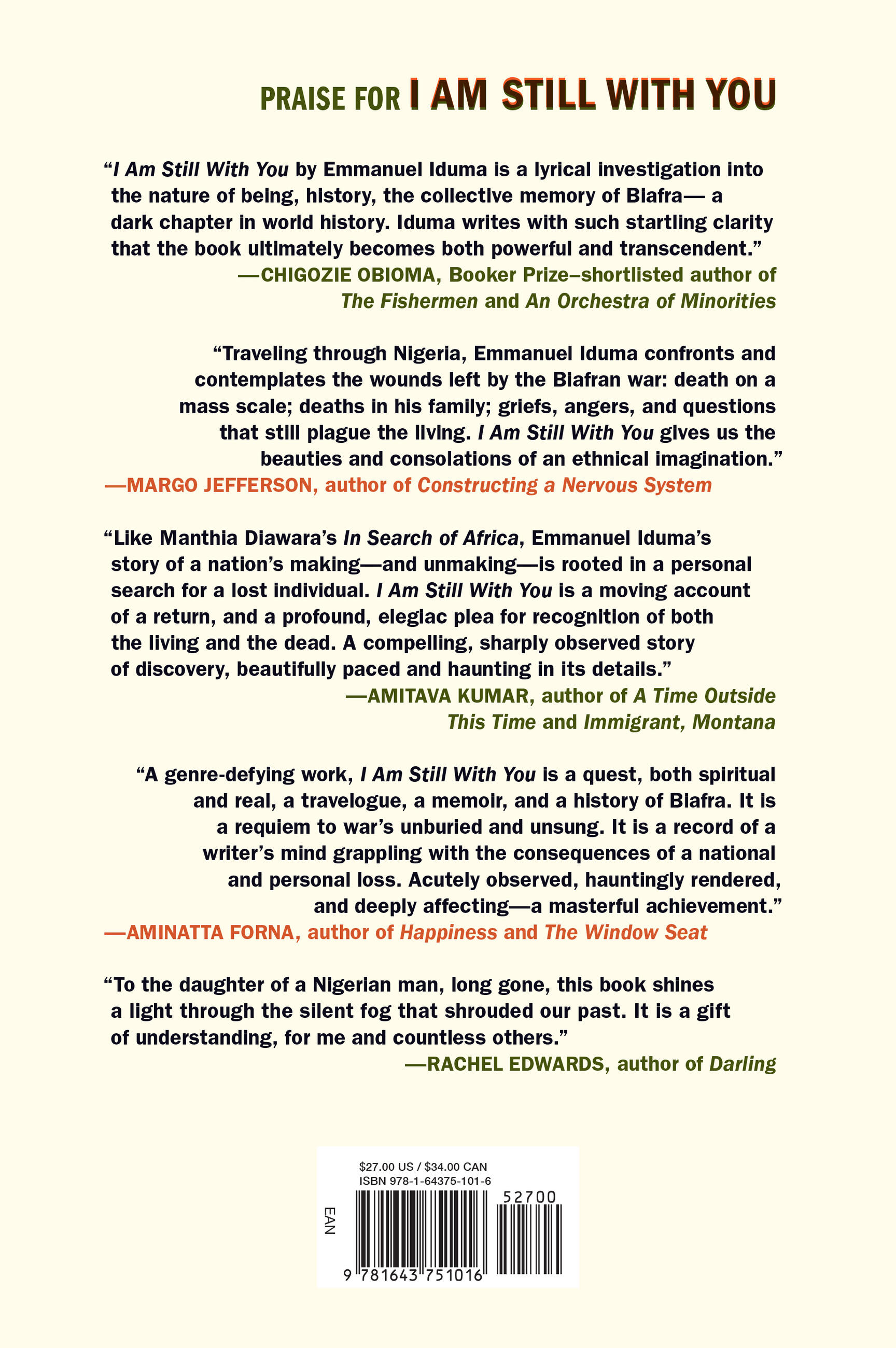 “Traveling through Nigeria, Emmanuel Iduma confronts and contemplates the wounds left by the Biafran war: death on a mass scale; deaths in his family; griefs, angers and questions that still plague the living. I Am Still With You is both epic and intimate. It gives us the beauties and consolations of an ethnical imagination.”Margo Jefferson, author of Constructing a Nervous System