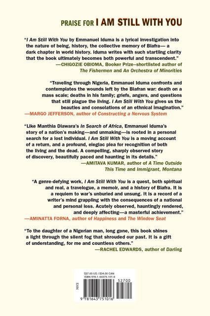 “A genre-defying work, I Am Still with You is a quest, both spiritual and real, a travelogue, a memoir, and a history of Biafra. It is a requiem to war’s unburied and unsung. It is a record of a writer’s mind grappling with the consequences of a national and personal loss. Acutely observed, hauntingly rendered, and deeply affecting—a masterful achievement.”Aminatta Forna, author of Happiness and The Window Seat