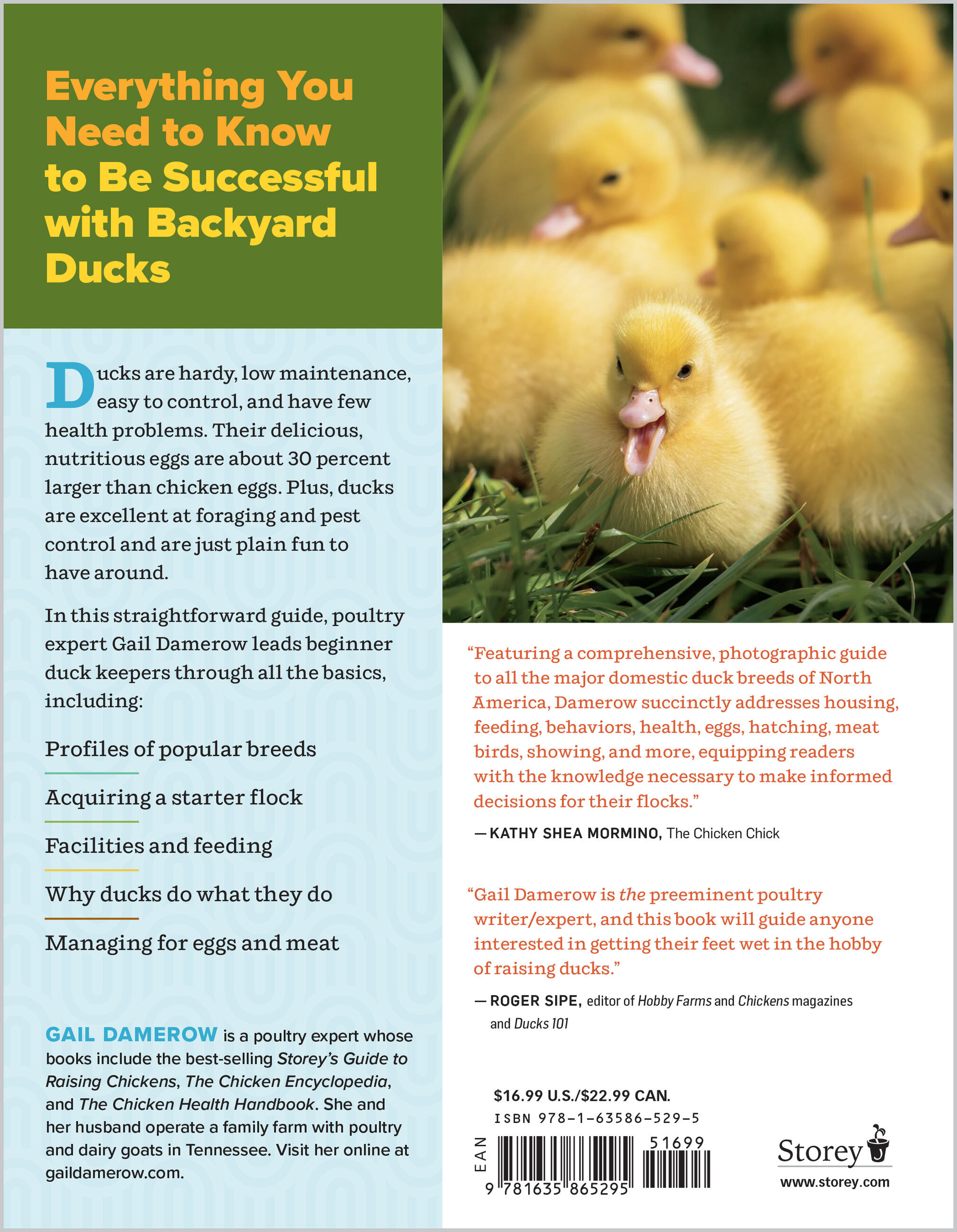 Ducks are quickly gaining on chickens as popular animals for the backyard homestead or small farm. They are friendly, productive, good at eating pests, remarkably healthy, and easier to raise than chickens in many ways. Plus, they are exceptionally adorable! This accessible introductory guide features original photography tracking the growth and care of a small flock of backyard ducks, and addresses everything the beginner duck keeper needs to know to be successful, including breed selection, housing, feeding, health care, understanding behavior, and egg and meat production.