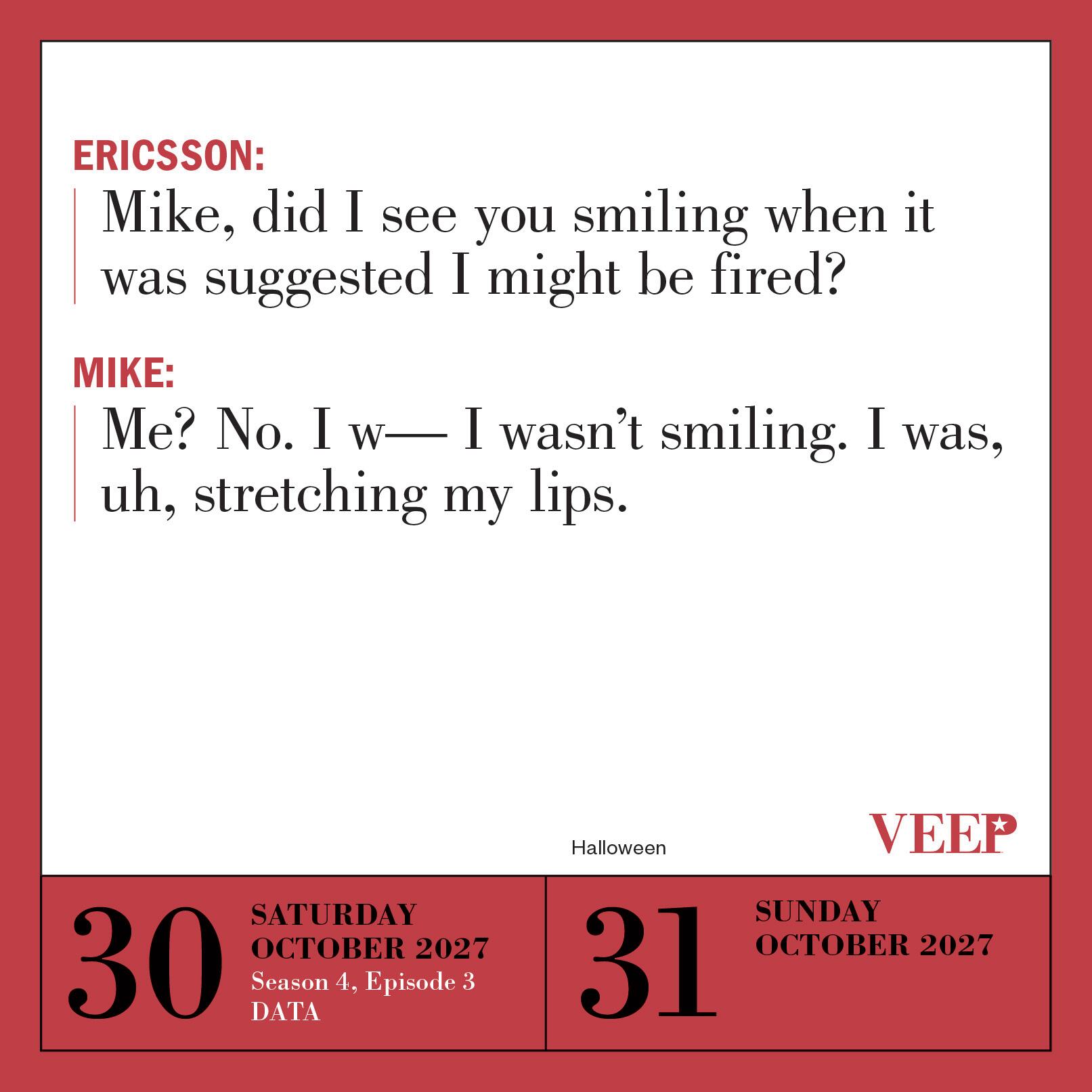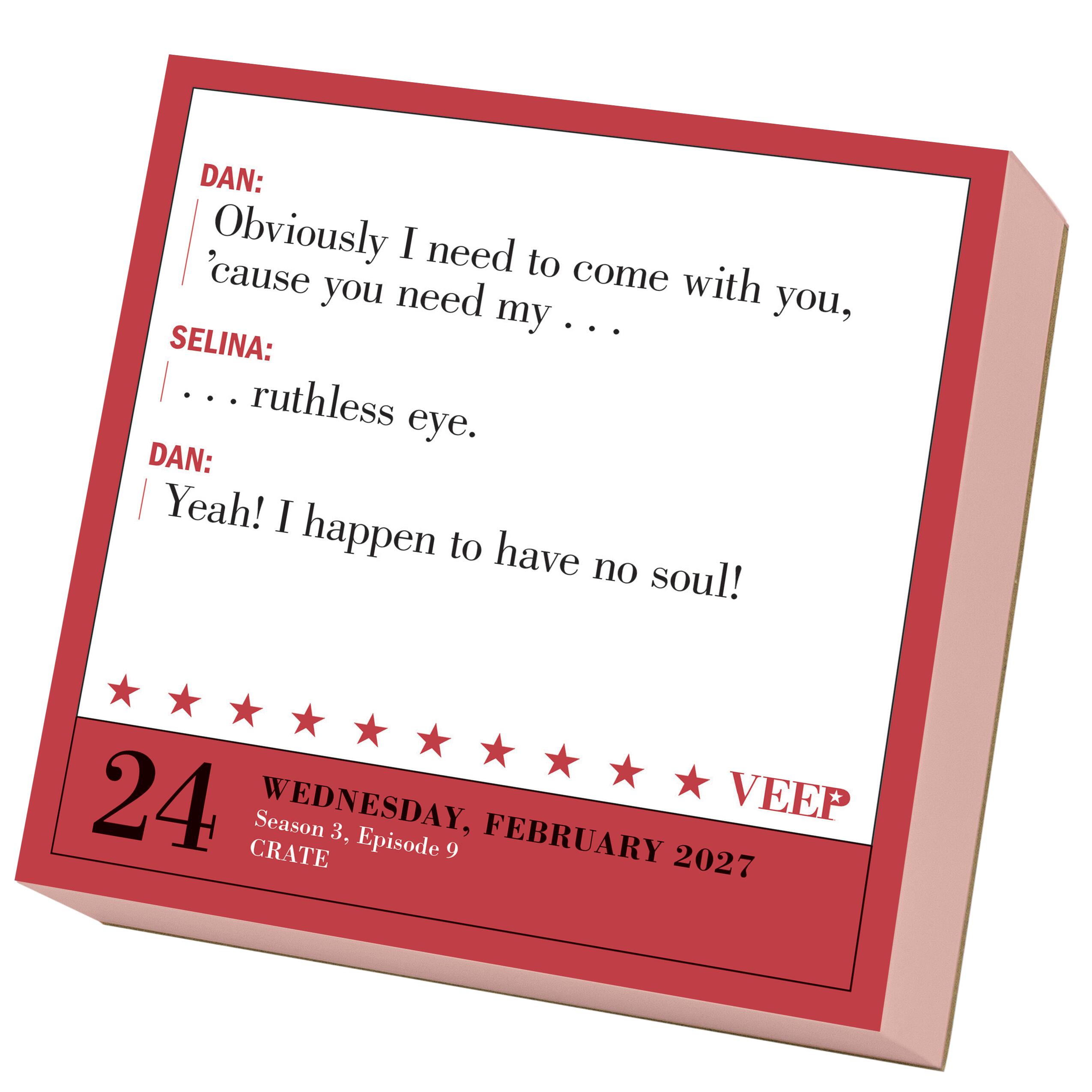 - THE OFFICIAL CALENDAR IS THE PERFECT GIFT FOR SUPERFANS: Check in to your daily laugh (or cringe) with a year of outrageous punchlines, hilarious burns, and politically incorrect exchanges from all your favorite VEEP characters.
