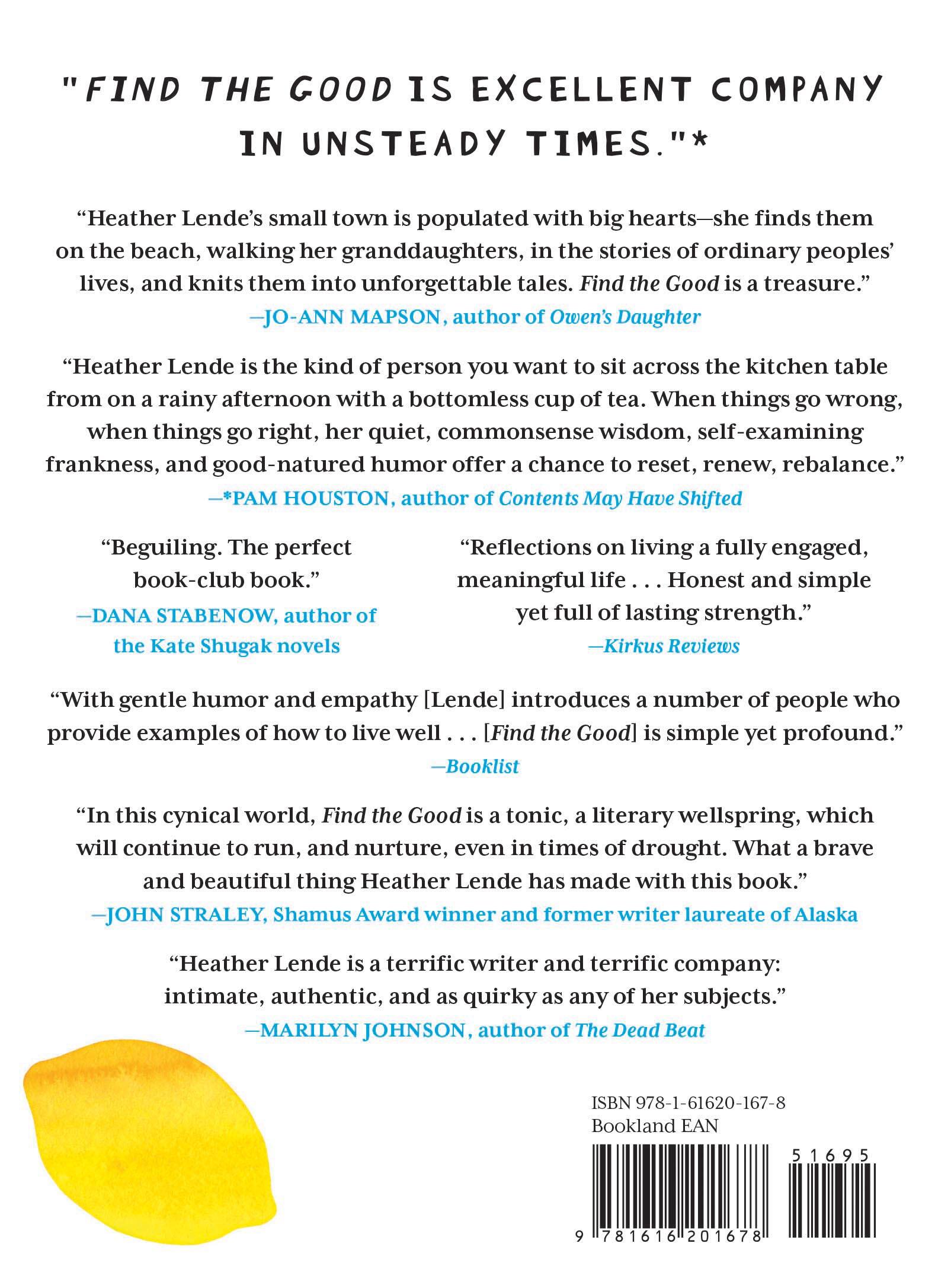 “In this cynical world, Find the Good is a tonic, a literary wellspring, which will continue to run, and nurture, even in times of drought. What a brave and beautiful thing Heather Lende has made with this book.” —John Straley, Shamus Award winner and former writer laureate of Alaska
