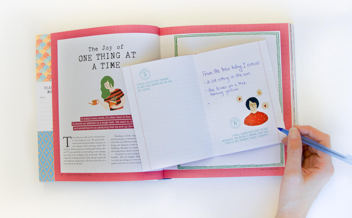Read about the benefits of not multitasking, then turn to “The Joy of One Thing at a Time Notebook” tucked into the pages. After a short piece on the power of slowing down, fill in the designed notecards for a Beautiful Moments jar. Make a personal timeline. Learn the art of hand-lettering. Dig into your Beginner’s Mind. Embrace the art of quitting. Take the writing cure. And always smile. Move slowly and with intention through A Book That Takes Its Time, and discover that sweet place where life can be both thoughtful and playful.