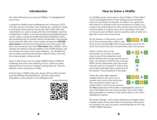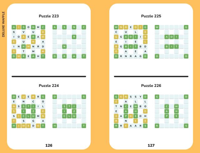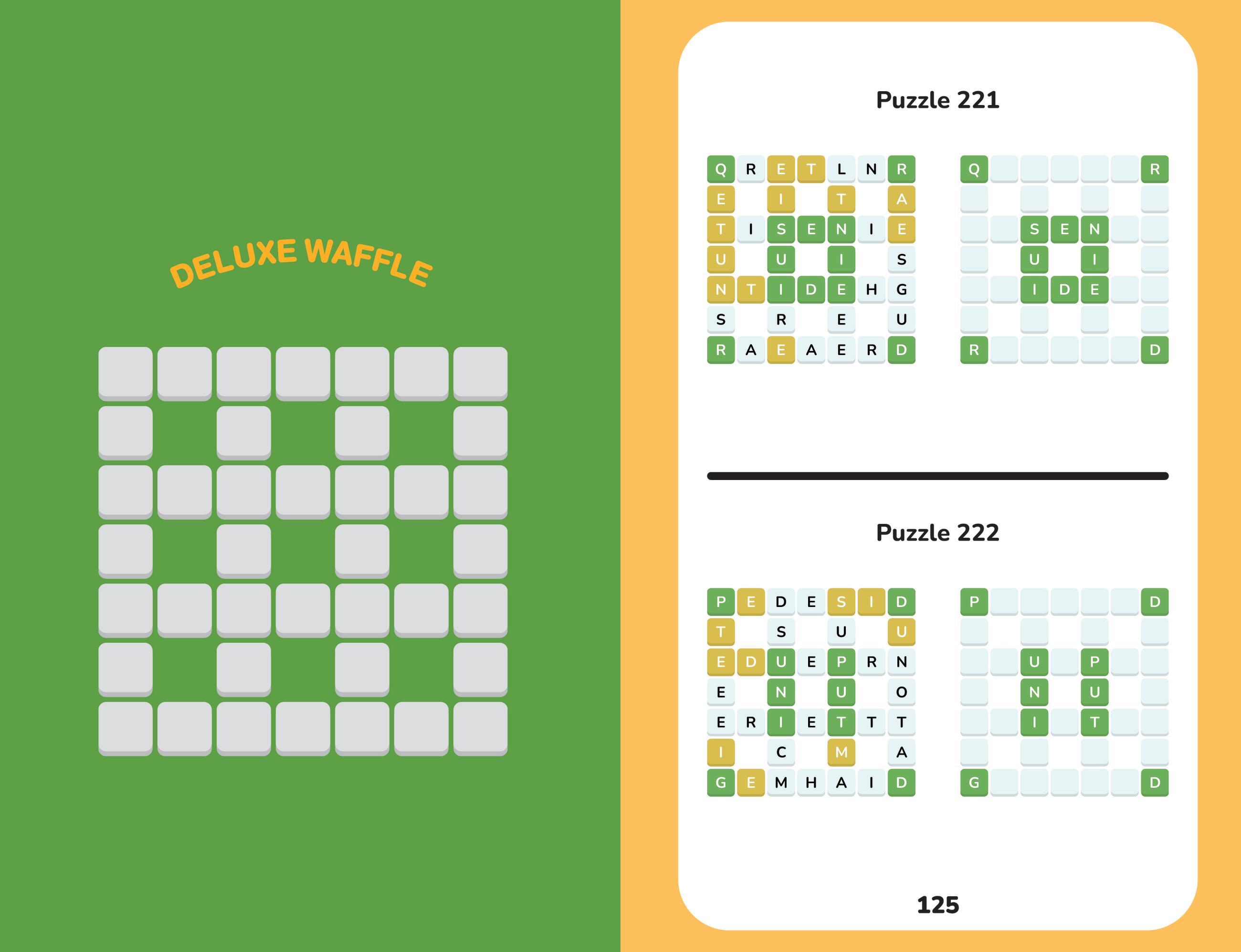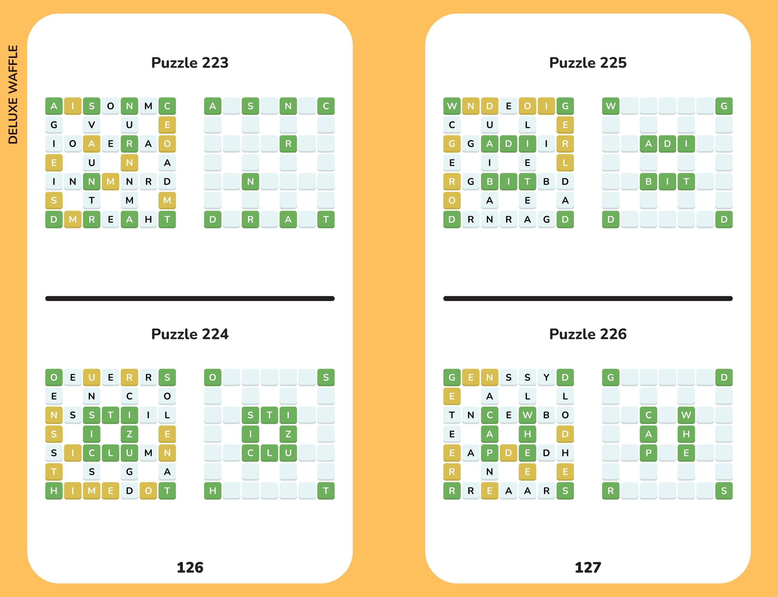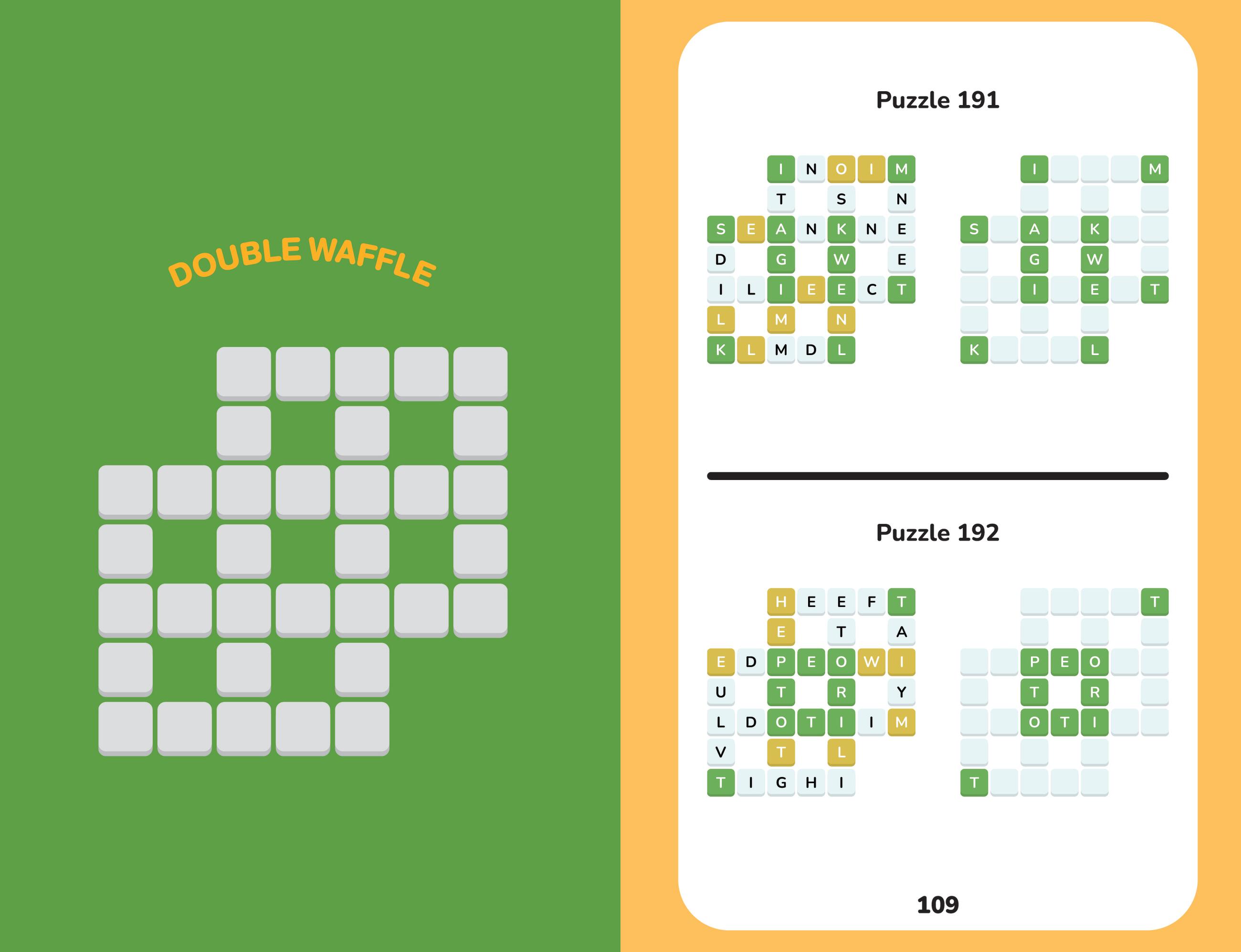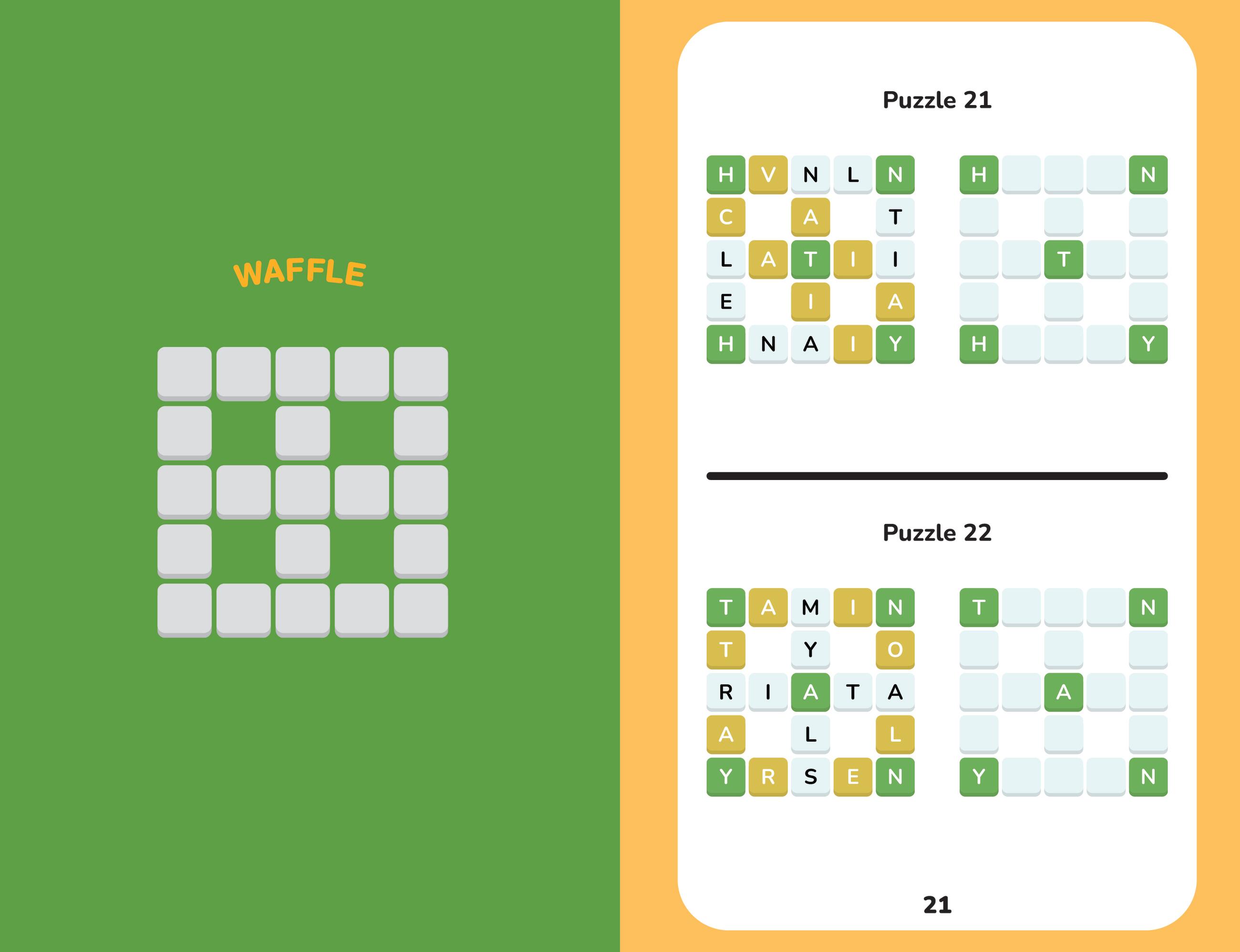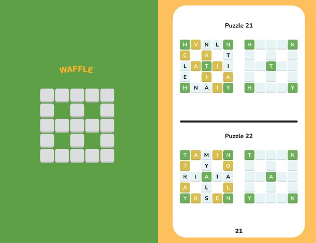 Of the many games that appeared online in the wake of the Wordle craze, Waffle is one of the best: easy to understand, fun to solve – and surprisingly well-suited to pencil-and-paper solving. The basic rules are simple: You are given a mini-crossword in which the letters have been scrambled. Letters on green squares are in the right position. Letters on yellow squares are in the right word, but not in the right position. (If they’re on an intersection, they could be in either crossing word.) Letters on white squares are not in the right word. Using logic and language skills, solvers narrow down what letters go where, crossing them off as they go, until their waffle is ready to serve!