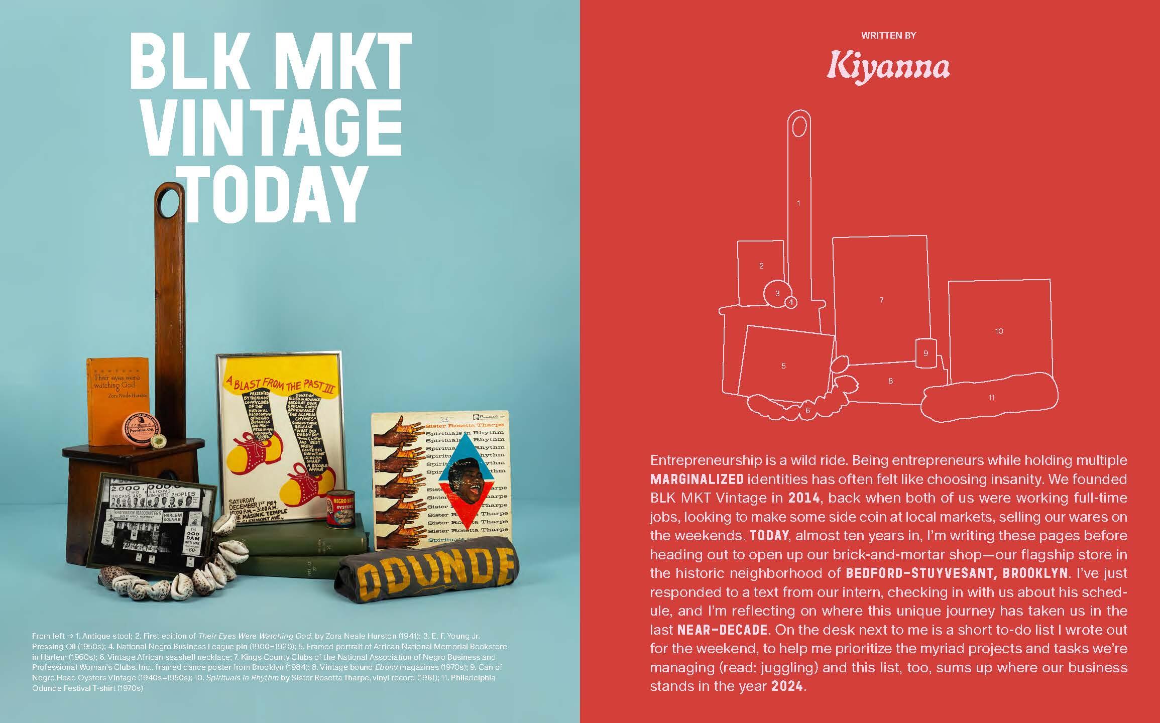 Jannah Handy and Kiyanna Stewart have spent years scouring piles, stacks, bookshelves, and dilapidated boxes in search of themselves and their history, Black history. Through their Brooklyn brick-and-mortar BLK MKT Vintage and online shop, they have uncovered tens of thousands of items including vintage literature, vinyl records, clothing, art, decor, furniture and more.