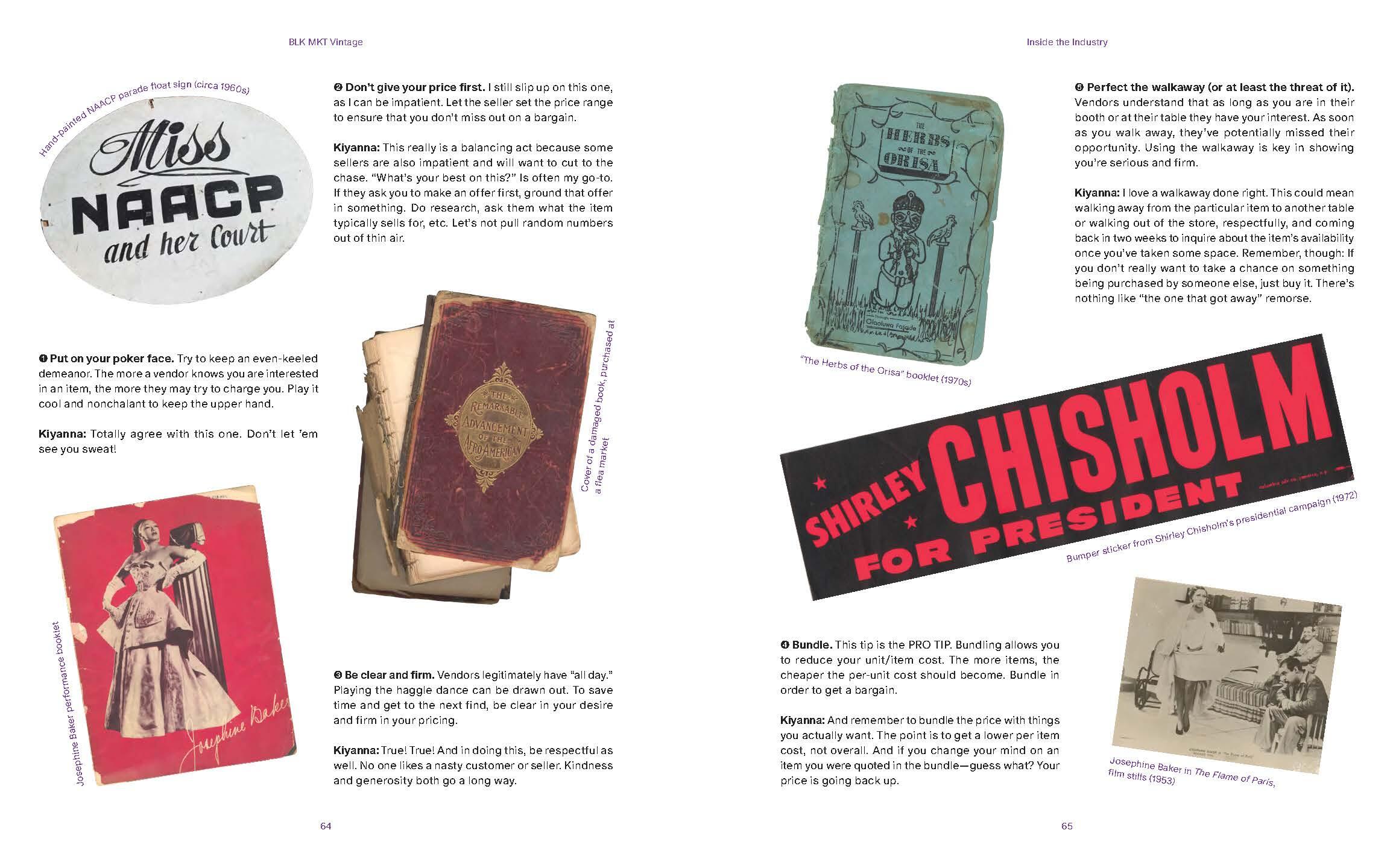 BLK MKT Vintage: Reclaiming Objects and Curiosities That Tell Black Stories invites readers into Handy and Stewart’s work and partnership as they pick, collect, curate, design, and reimagine futures for the objects of the past. Brimming with more than 300 photographs of vintage pieces of ephemera, the book is a beautiful, ephemeral object itself calling to mind a scrapbook or family album that has a surprise on every page whether that’s 1972 celluloid pins from Shirley Chisholm’s presidential campaign, early 1800’s hand-drawn maps of the African continent, or 1920’s bound yearbooks from various HBCUs. The book also explores the various concepts that ground Handy and Stewart’s work; interviews with Black archivists, artists, memory workers and collectors – including a foreword from Spike Lee; a look into their private collection of thousands of items they have discovered over the years; an explanation of the different players in the antiques and vintage world; and tips and tricks on how to begin your own collection and curate physical spaces that reflect your identity and experience.