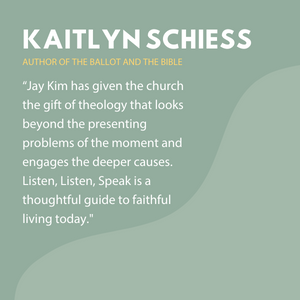 "So much of our political dysfunction is the result not only of theological failure but spiritual malformation – and this book powerfully addresses both. Jay Kim has given the church the gift of theology that looks beyond the presenting problems of the moment and engages the deeper causes. Listen, Listen, Speak is a thoughtful guide to faithful living today."Kaitlyn Schiess, Author of The Ballot and the Bible