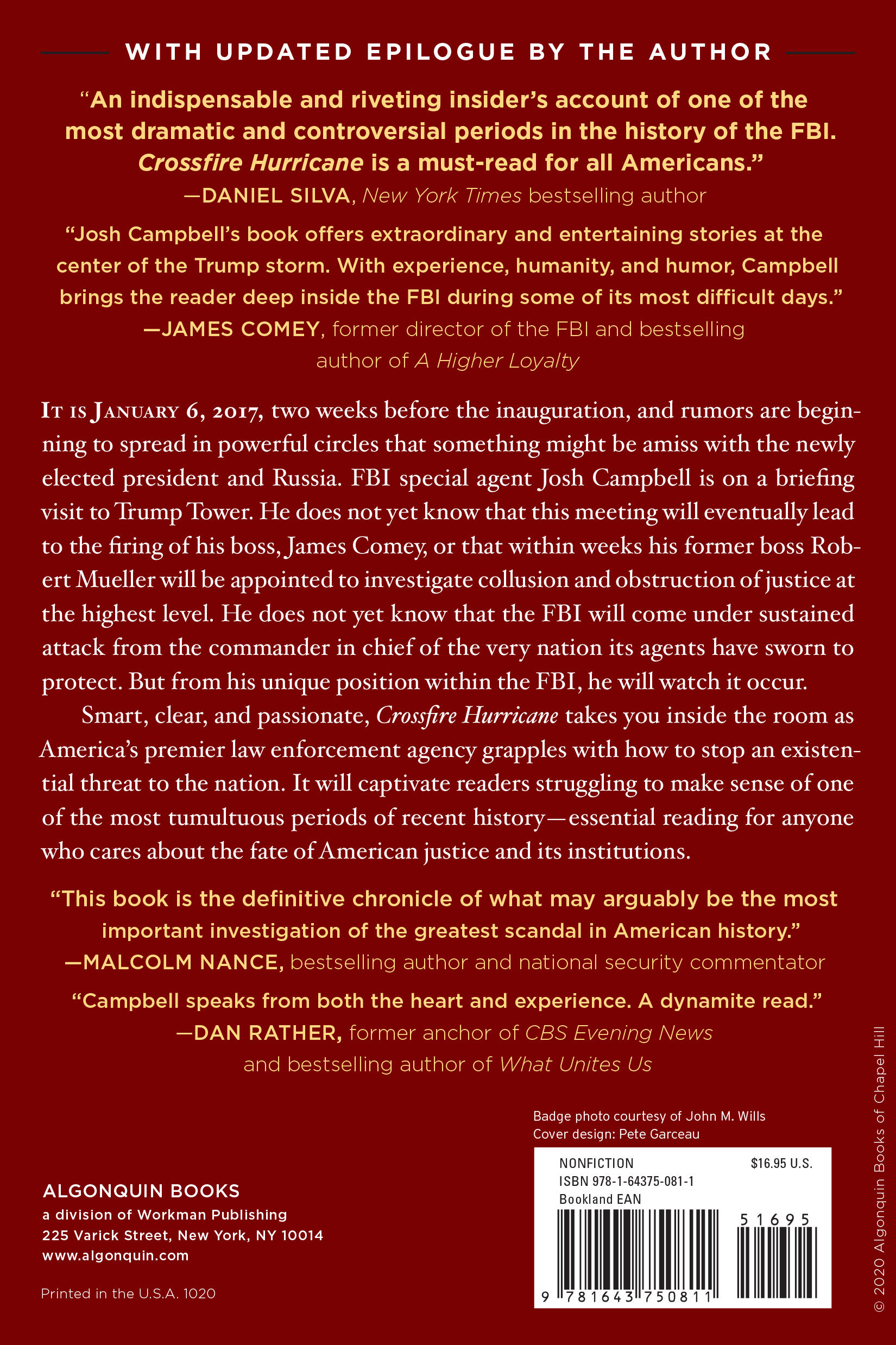 “Josh Campbell had the ultimate insider’s perch as President Trump initiated the greatest crisis in the modern history of the FBI. Crossfire Hurricane is his fascinating account of those tumultuous days and a vivid reminder of the importance of honor and candor in law enforcement and politics.”