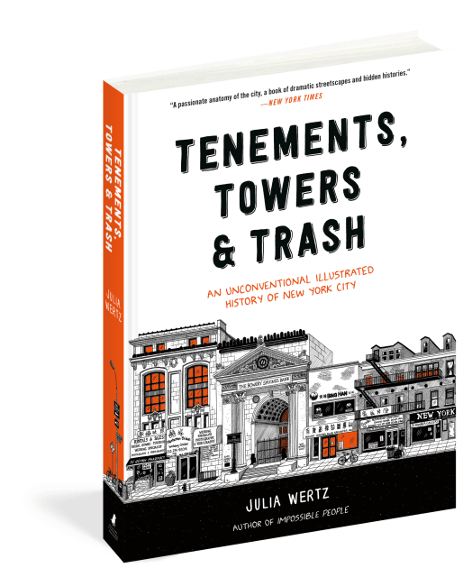 From bars, bakeries, and bookstores to food carts, street cleaners, and apartments both cramped and grand, Tenements, Towers & Trash is a wild ride in a time machine taxi from the present day city to bygone days of yore.