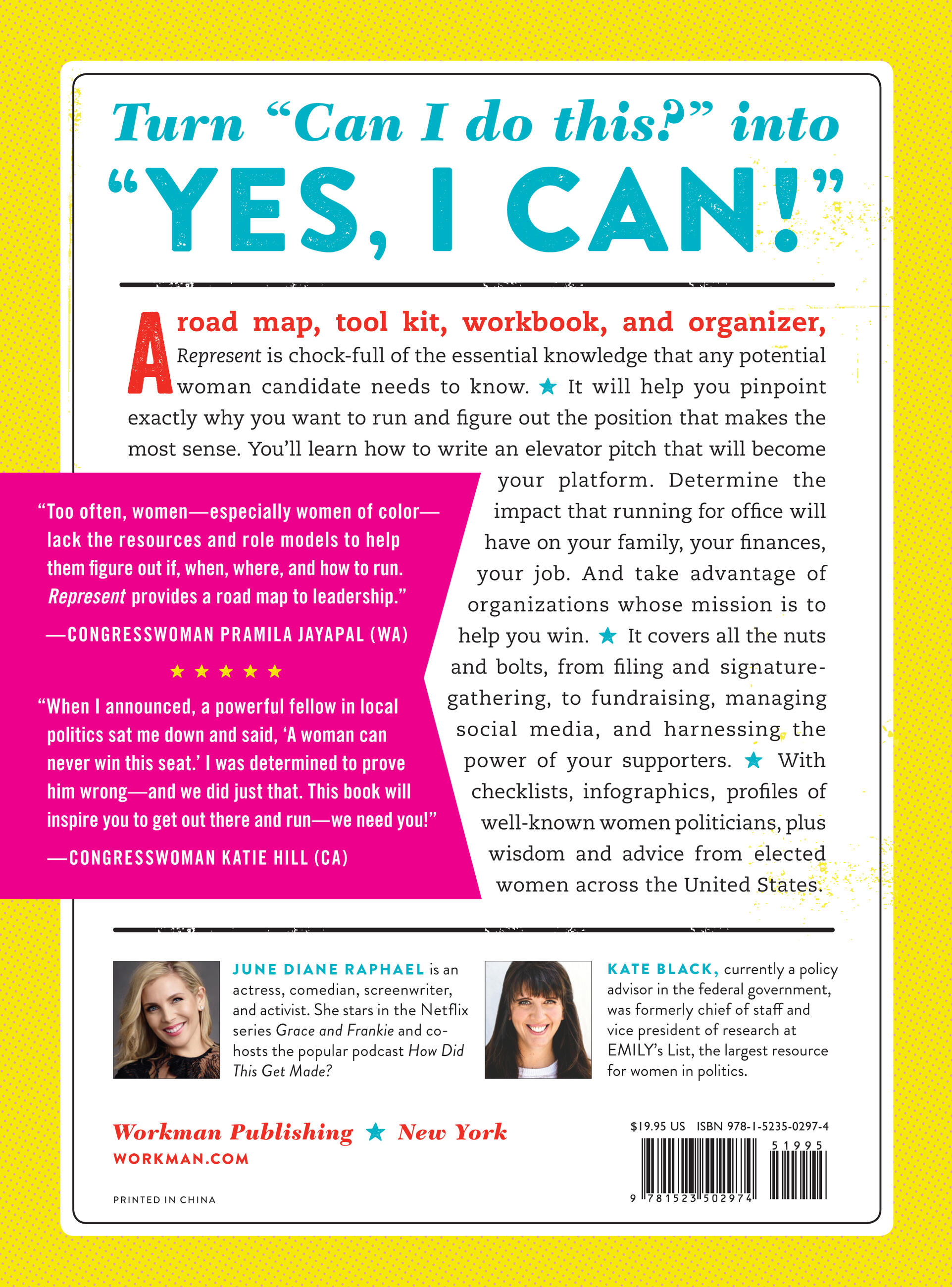 “Over the last few years we’ve seen a remarkable surge of women running for office, and even better, winning. Running takes courage, passion, and commitment, but it also takes books like this. June and Kate have created a wonderful resource for women as they think about taking the leap.”Congresswoman Pramila Jayapal (WA) “Approachable and practical… [It’s] an indispensable resource for women considering a political run.” – Library Journal, starred review “This timely, step-by-step guide will appeal to women of all ages who are considering a political career.” – Booklist “[A]n indispensable resource for women with any interest in public service; its advice is a powerful bridge from vague dreams to making them happen.” – Publishers Weekly “A first-of-its-kind workbook full of tools, inspiration and tips for women running for office” –Bust Magazine "This book is chock-full of what-to-expects and how-to-handles, and trust me, you're going to need them all."– Bustle