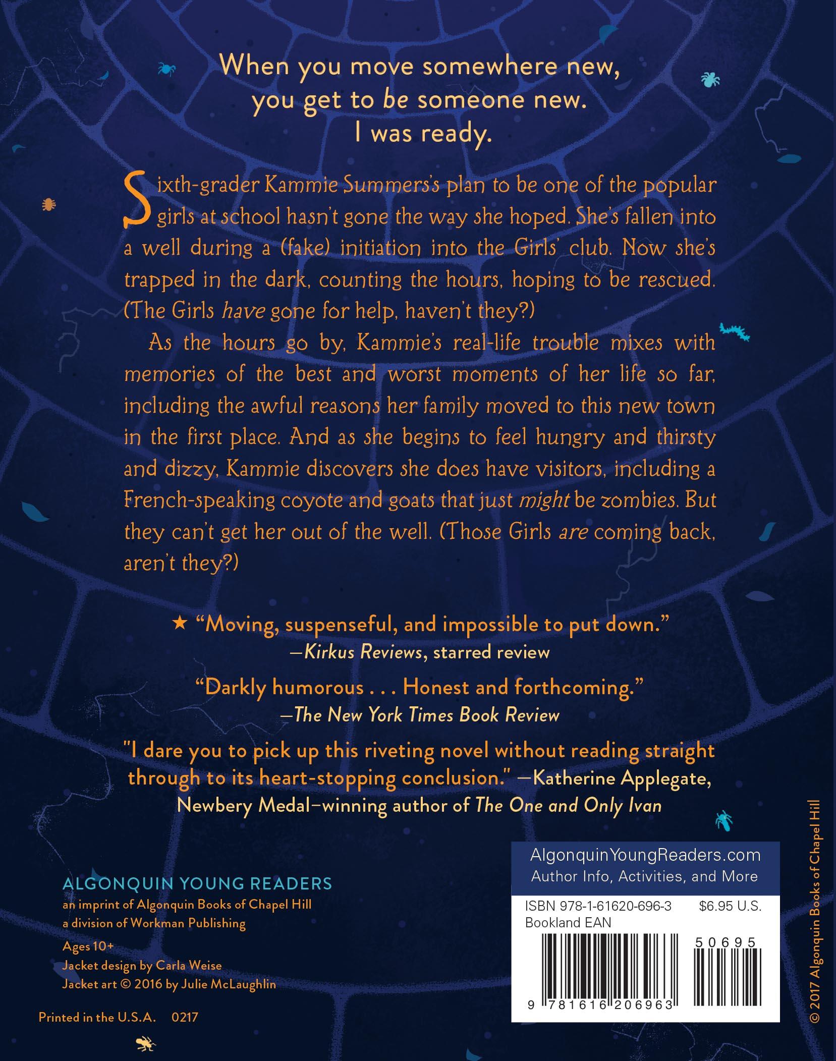 When you move somewhere new, you get to be someone new. I was ready.Sixth-grader Kammie Summers’s plan to be one of the popular girls at school hasn’t gone the way she hoped. She’s fallen into a well during a (fake) initiation into the Girls’ club. Now she’s trapped in the dark, counting the hours, hoping to be rescued. (The Girls have gone for help, haven’t they?)