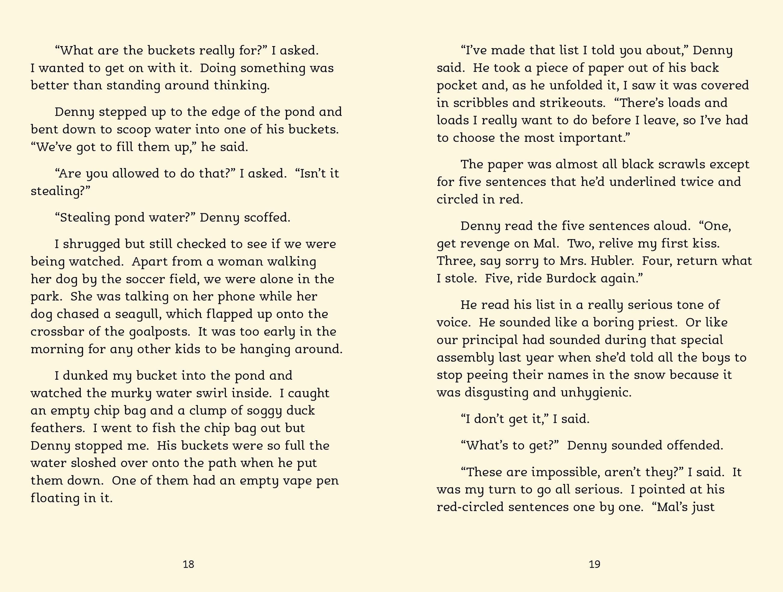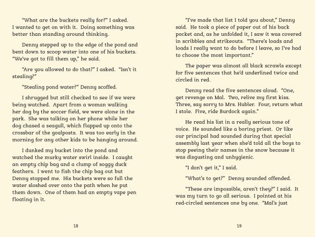 It’s the end of the summer and Denny is moving away with his mother now that she’s found a good job, but he’s not planning on leaving quietly. He’s made a list of scores to settle, wrongs to right before he goes, and he’s asked his best friend, Jake, to help.