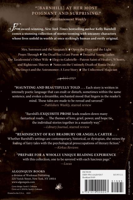 When Mrs. Sorensen’s husband dies, she rekindles a long-dormant love with an unsuitable mate in “Mrs. Sorensen and the Sasquatch.” In “Open the Door and the Light Pours Through,” a young man wrestles with grief and his sexuality in an exchange of letters with his faraway beloved. “Dreadful Young Ladies” demonstrates the strength and power—known and unknown—of the imagination. In “Notes on the Untimely Death of Ronia Drake,” a witch is haunted by the deadly repercussions of a spell. “The Insect and the Astronomer” upends expectations about good and bad, knowledge and ignorance, love and longing. The World Fantasy Award–winning novella “The Unlicensed Magician” introduces the secret magical life of an invisible girl once left for dead—with thematic echoes of Barnhill’s Newbery Medal–winning novel, The Girl Who Drank the Moon.