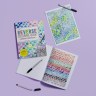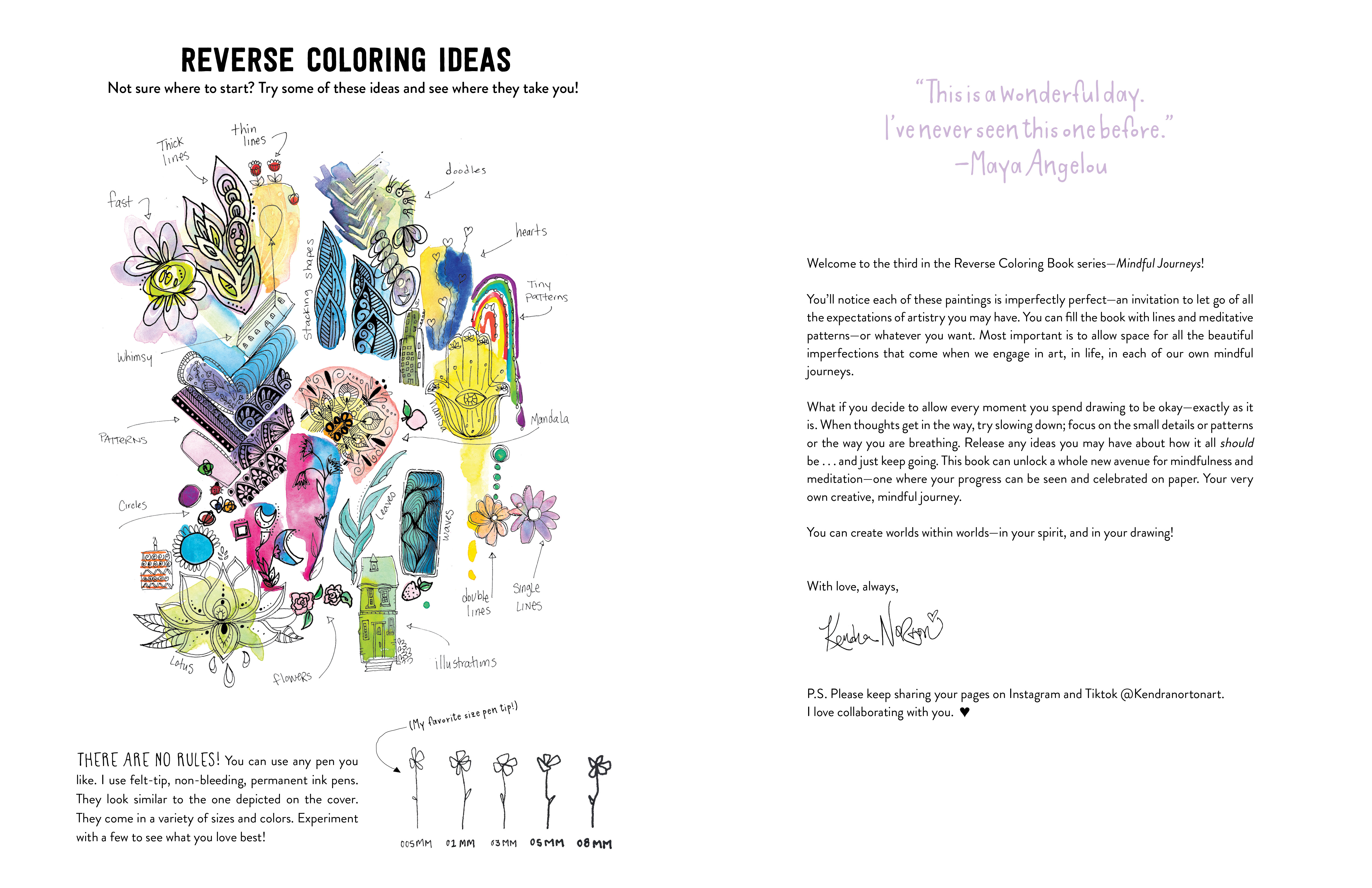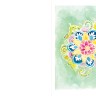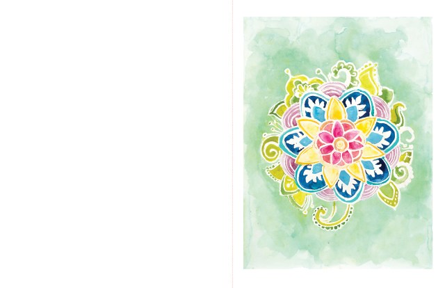 Each of the first two Reverse Coloring books—with over 205,000 copies in print in just a year—frees the imagination and encourages the user to be calm and creative. But Mindful Journeys takes it one step further with 50 new and original watercolors created specifically to promote mindfulness. Abstract compositions in calming blues and greens. A shower of circles that suggests the infinity of the sky. Swirls of flowery patterns that evoke mandalas. Spiritual symbols, like a yin-yang, a hamsa hand, a flaming heart. Watery waves, and a curling peacock feather.