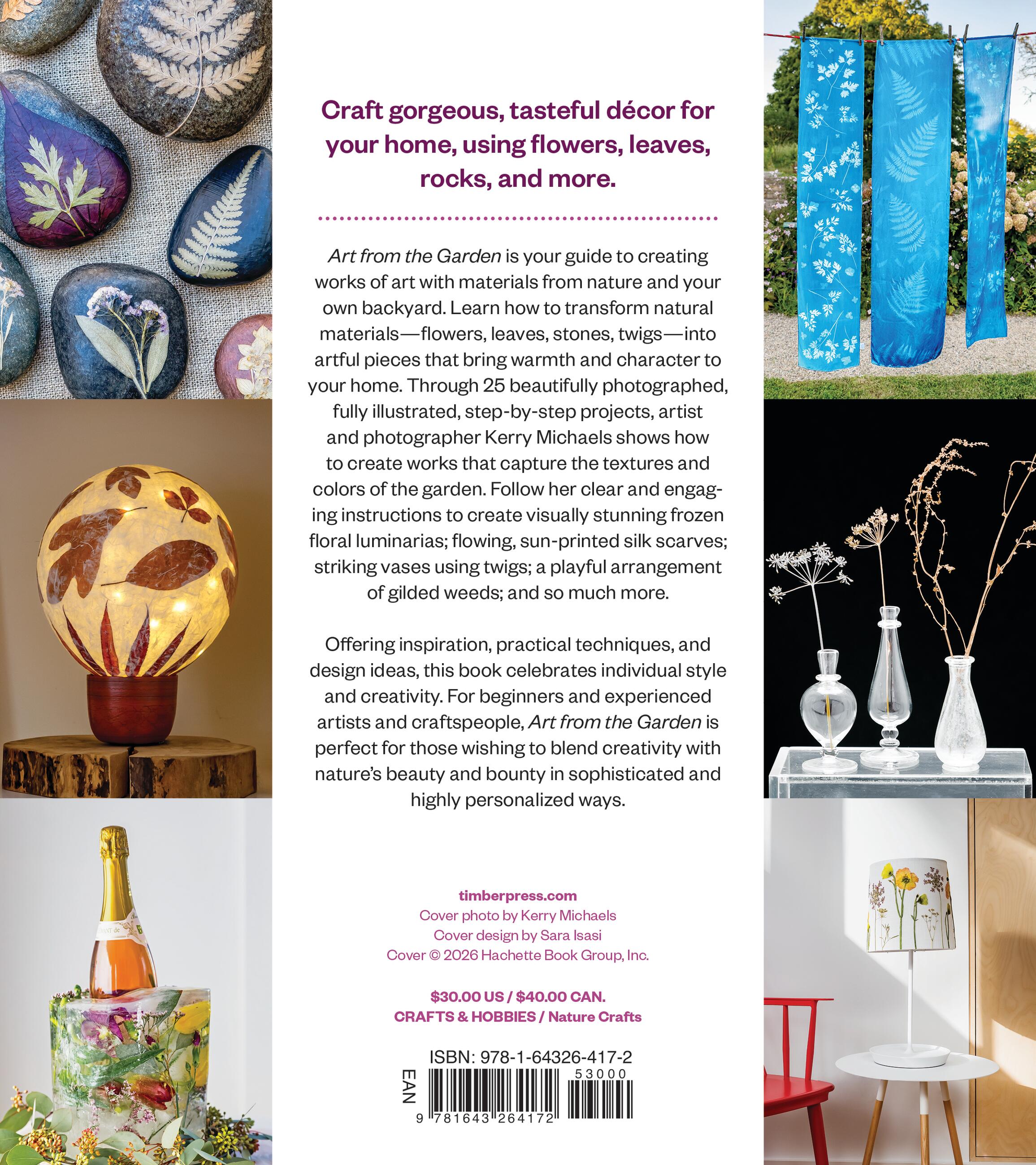 This is a gorgeously photographed, warmly detailed guide to creating works of art with materials (mostly) from your own garden. Create chic vases from twigs, visually stunning luminarias using water, your own gorgeous blooms, and a freezer, cyanotype prints with a branch and the power of the sun, and other striking projects. The 25 step-by-step projects are easy to find, nestled into categories like pressed flowers, frozen botanicals, cyanotype, wrapped stones, so on. Artist and photographer Kerry Michaels lends her artistic and photographic talent, refined eye, and warm writing voice to this book for folks who want to bring nature into their home in sophisticated, highly personalized ways.