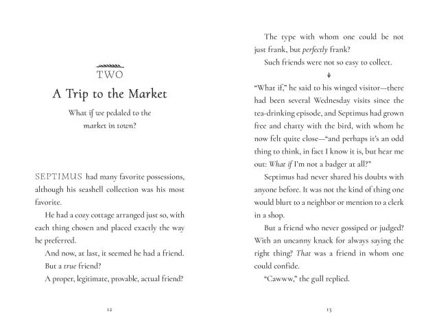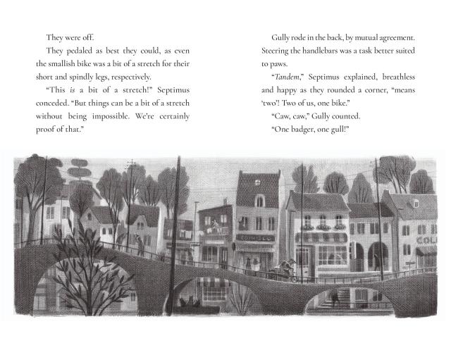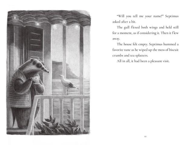 When a gull of very few words lands on the windowsill, Septimus leaps at the possibility of friendship. However, his new confidant soon goes missing and Septimus is bereft. Determined to find his best—and only—friend, he ventures into new territory and encounters a cast of surprising characters. Can Septimus be as brave and bighearted as he’ll need to be to find Gully? Or is he really a bad badger after all?