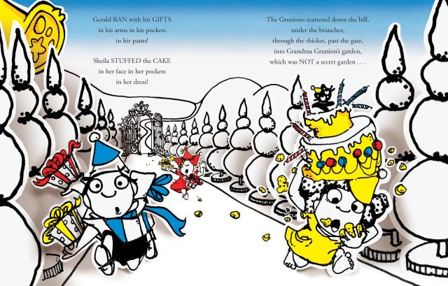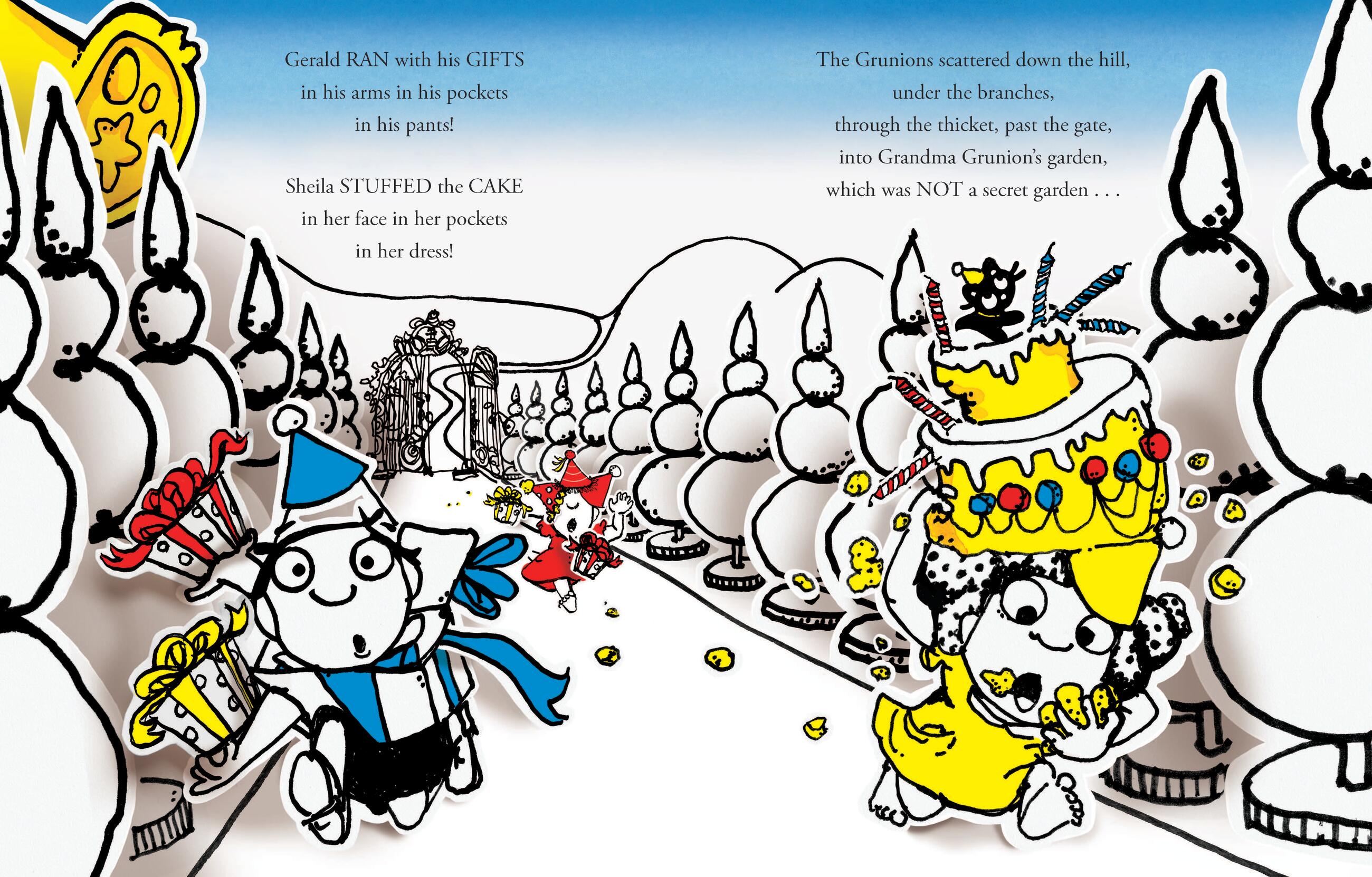 Surprised are the Grunions when the Birthday Bear appears, hungry for sweet, sweet . . . children. The Grunions are off on a birthday adventure like none other full of secret garden secrets, a well-wishing wishing well, and ever looming huffs and puffs of confetti and birthday cake breath. Will Geraldine, Gerald, and Sheila outsmart the Birthday Bear? You’ll be SURPRISED!