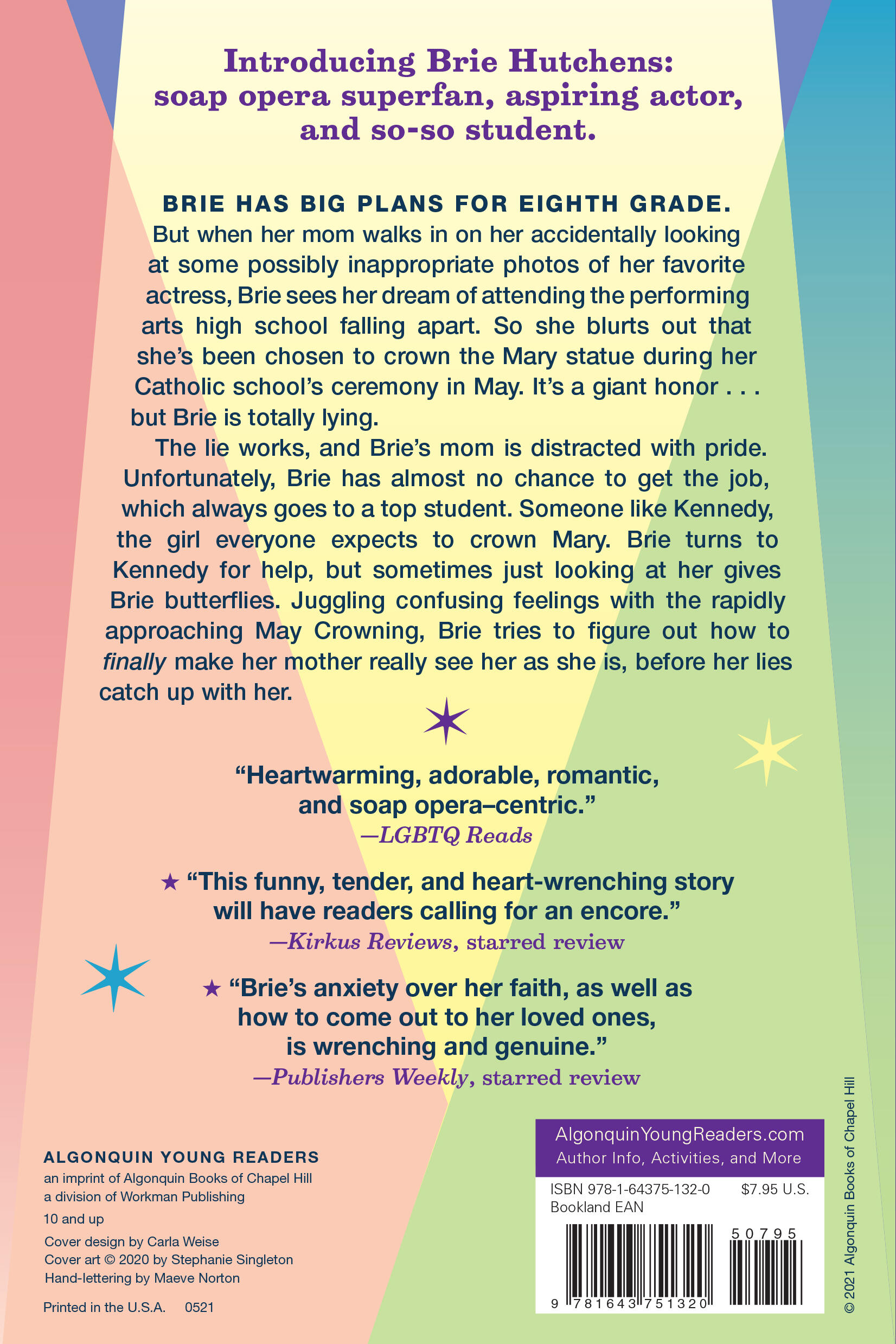 Brie has big plans for eight grade. But when her mom walks in on her accidentally looking at some possibly inappropriate photos of her favorite actress, Brie sees her dream of attending the performing arts high school falling apart. So she blurts out that she’s been chosen to crown the Mary statue during her Catholic school’s ceremony in May. It’s a giant honor . . . but Brie is totally lying.