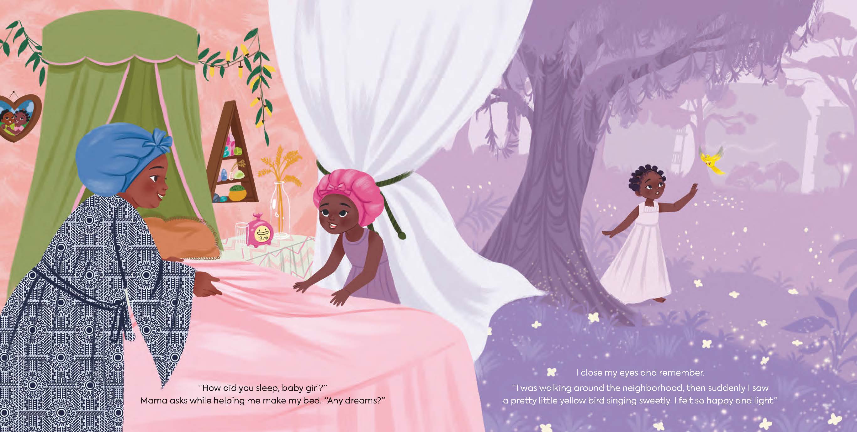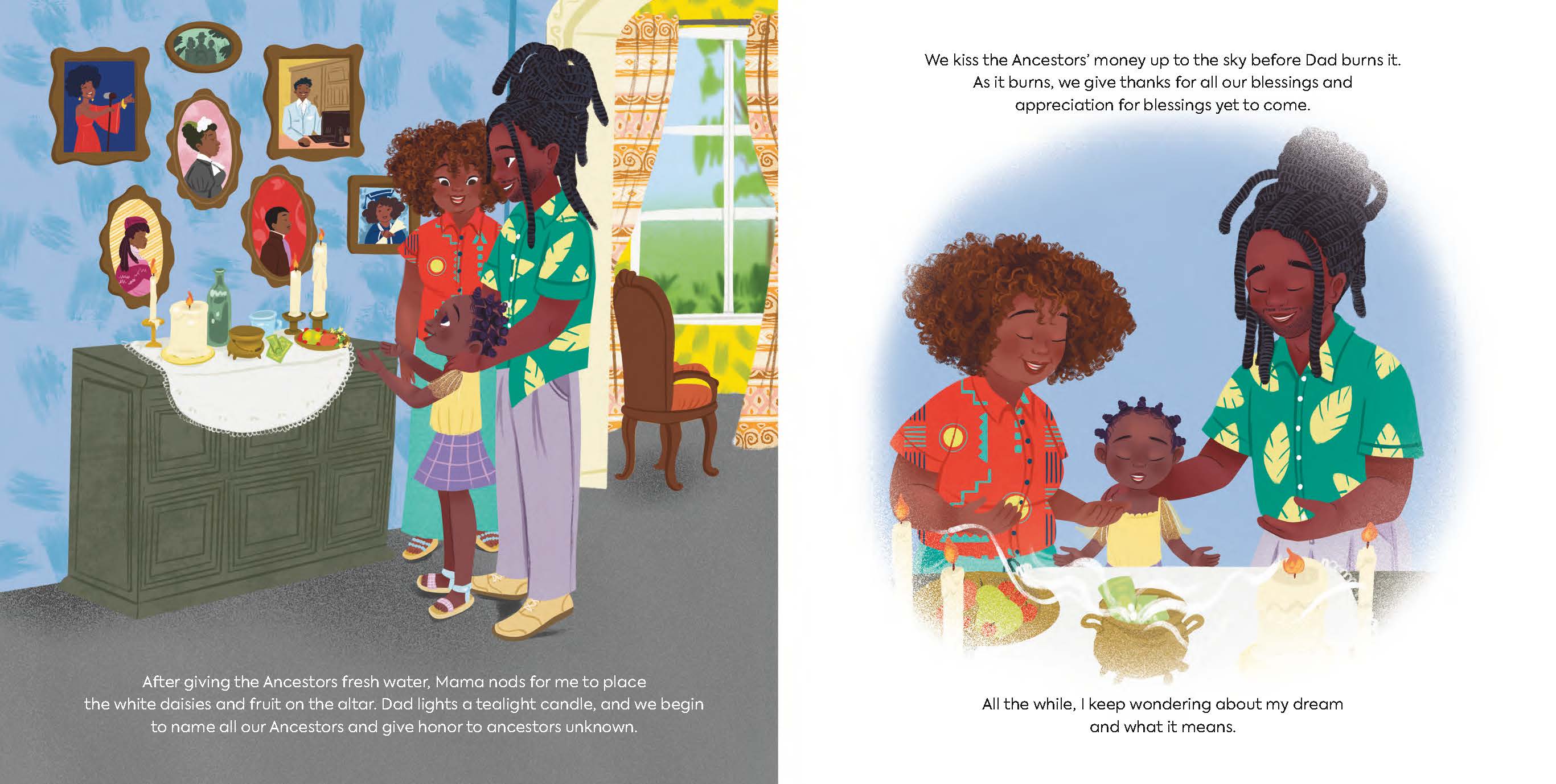 Dayo practices Hoodoo with her family. One Saturday, she wakes from an interesting dream about a yellow bird. What could it mean? She knows that it’s up to her to figure it out. Over the course of the day, as Dayo and her family move through their daily rituals (mantras and affirmations included), the message sent from her Ancestors through her dream reveals itself. This celebration of spirituality (and heritage) highlights the rich history of Hoodoo and the beauty we can find in everyday magic.