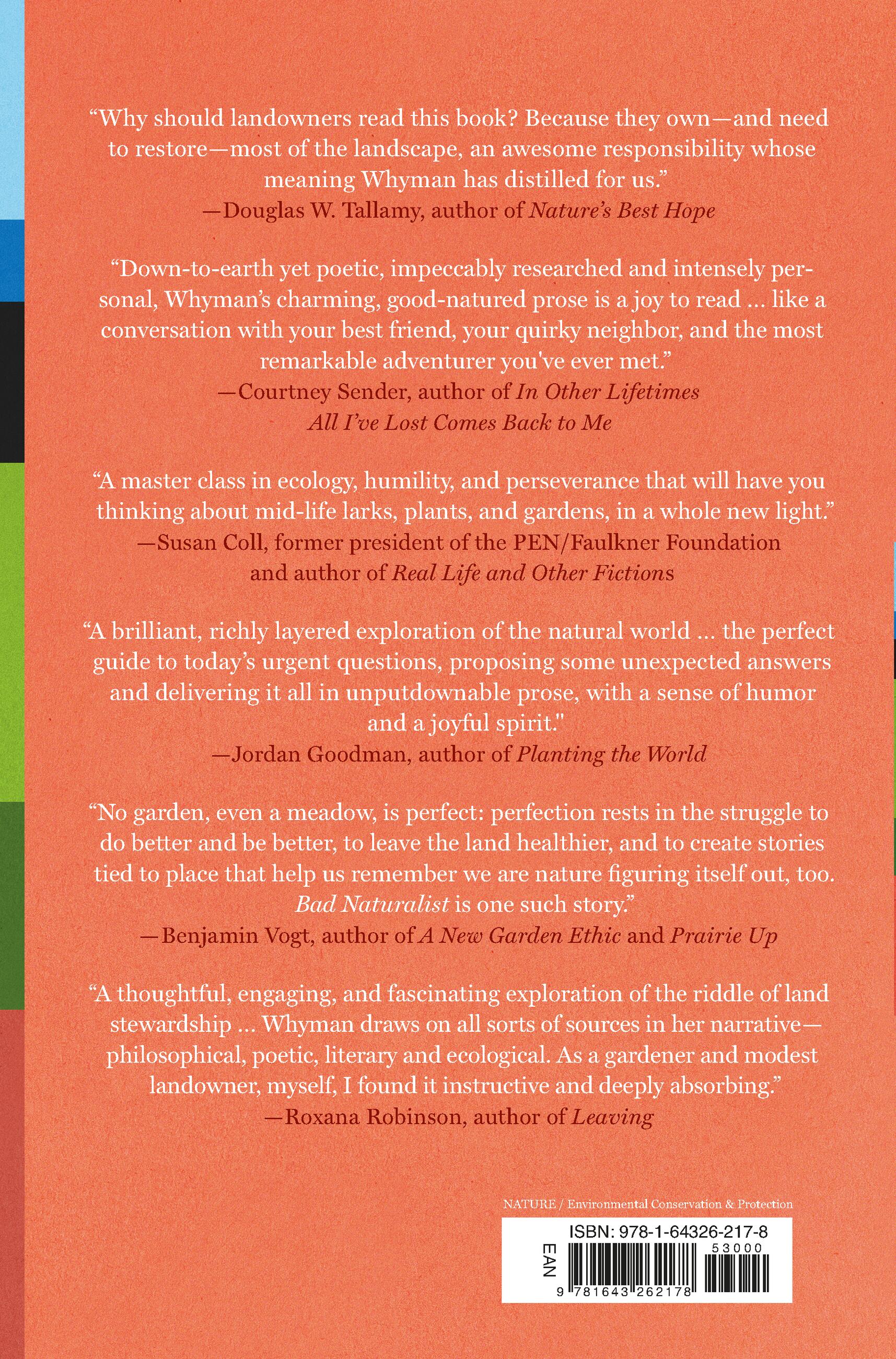 "Bad Naturalist is a thoughtful, engaging, and fascinating exploration of the riddle of land stewardship. What is a weed? What should you eliminate, and what can you protect? And what does it mean to own property? Whyman is eager, curious, and humble in the description of her journey as the owner of a 200-acre mountaintop in Virginia. She draws on all sorts of sources in her narrative —philosophical, poetic, literary and ecological. As a gardener and modest landowner, myself, I found it instructive and deeply absorbing. Brava!"Roxana Robinson, author of Leaving