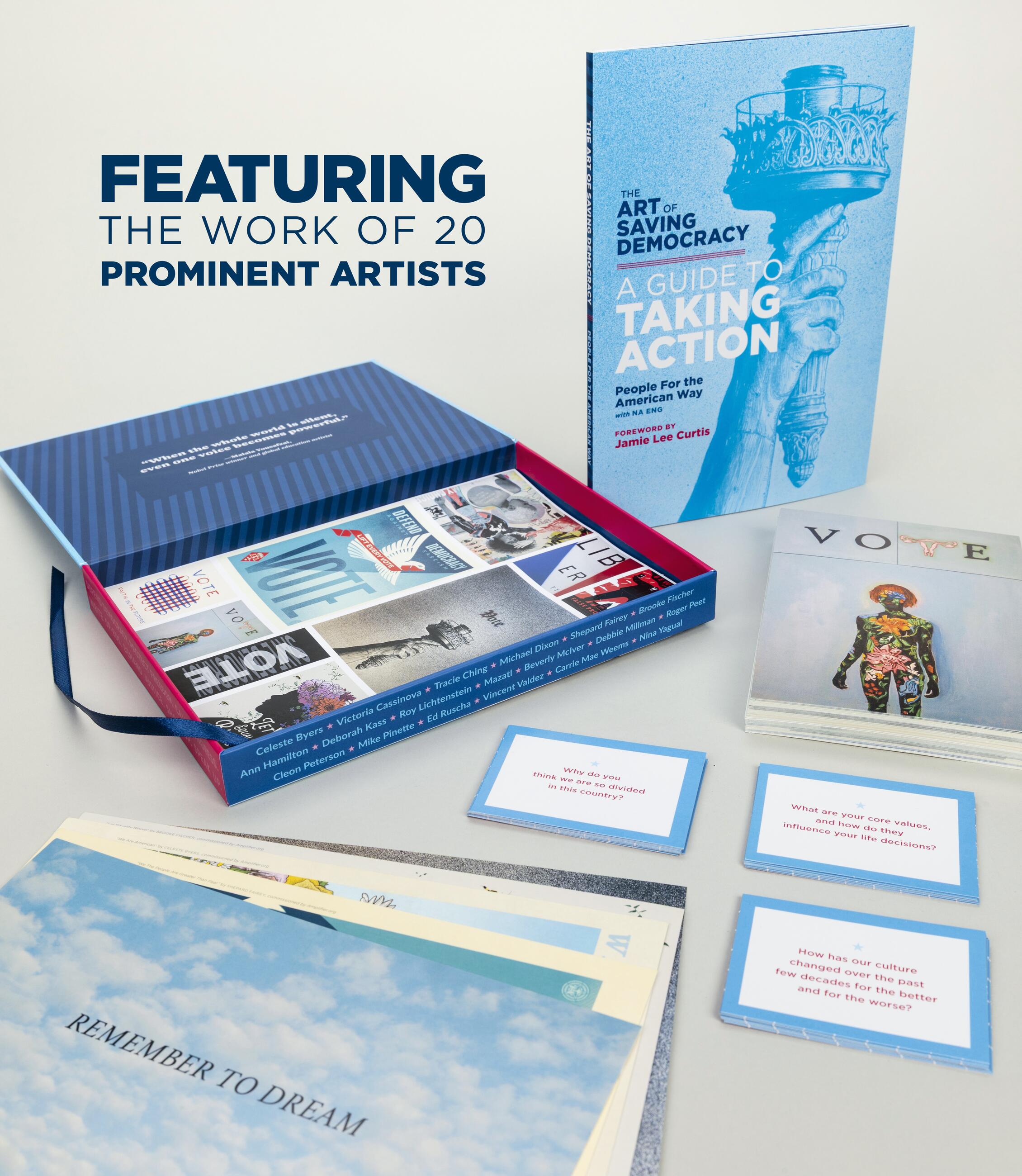 The Art of Saving Democracy features the work of 20 renowned American artists—such as Roy Lichtenstein, Shepard Fairey, Carrie Mae Weems, Vincent Valdez, and Deborah Kass—and includes: