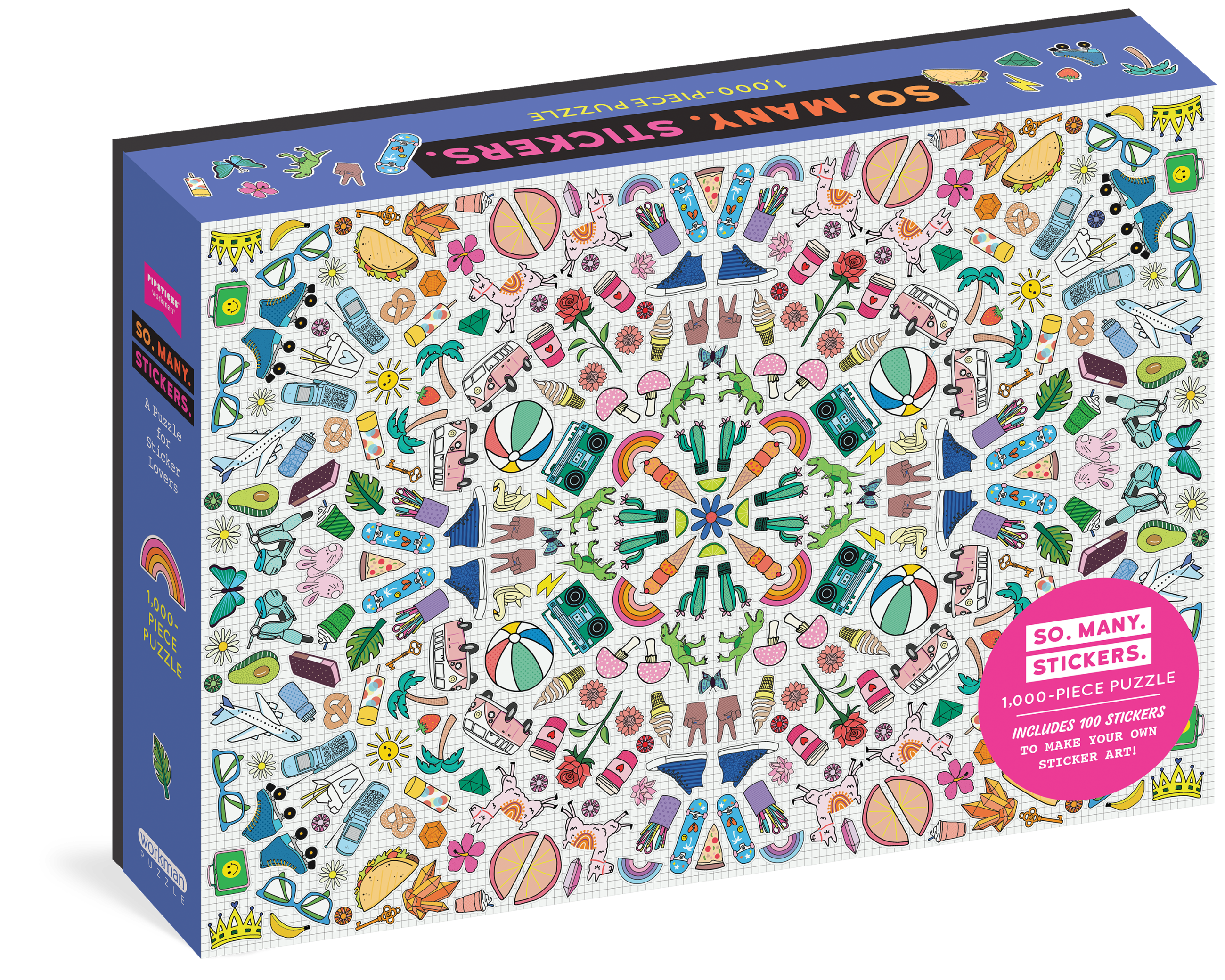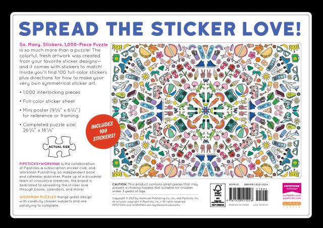 So. Many. Stickers. 1,000-Piece Puzzle is so much more than a puzzle! The colorful, fresh artwork was created from your favorite sticker designs—and it comes with stickers to match! Inside you’ll find 100 full-color stickers plus directions for how to make your very own symmetrical sticker art.