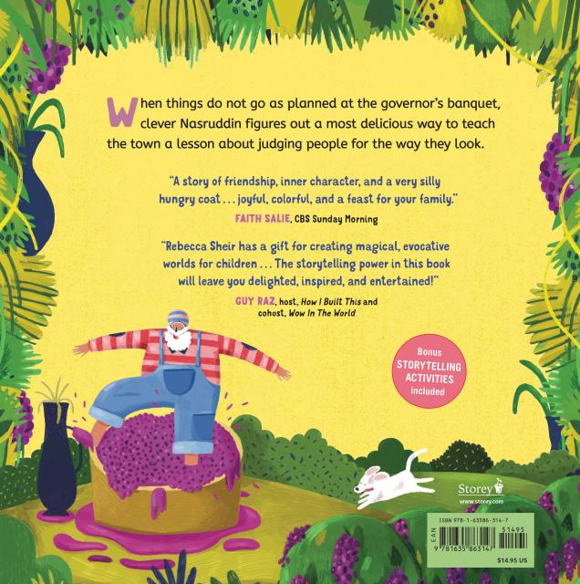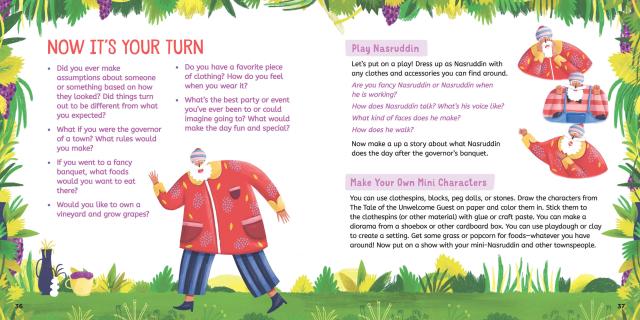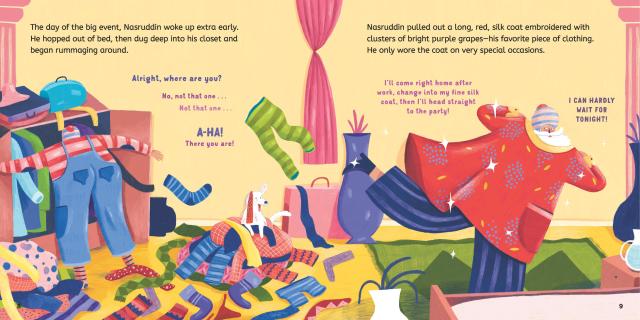 On the day of the celebration, Nasruddin works hard in his vineyard picking and squishing grapes. He planned to wear his special long red silk coat, but at the end of the day it’s too late for him to go home and change! When he arrives at the banquet in his grape-juice-stained work clothes, he looks different from what the townspeople were expecting. But Nasruddin is a clever fellow—and he figures out a most delicious way to teach the town a lesson about judging people for the way they look.