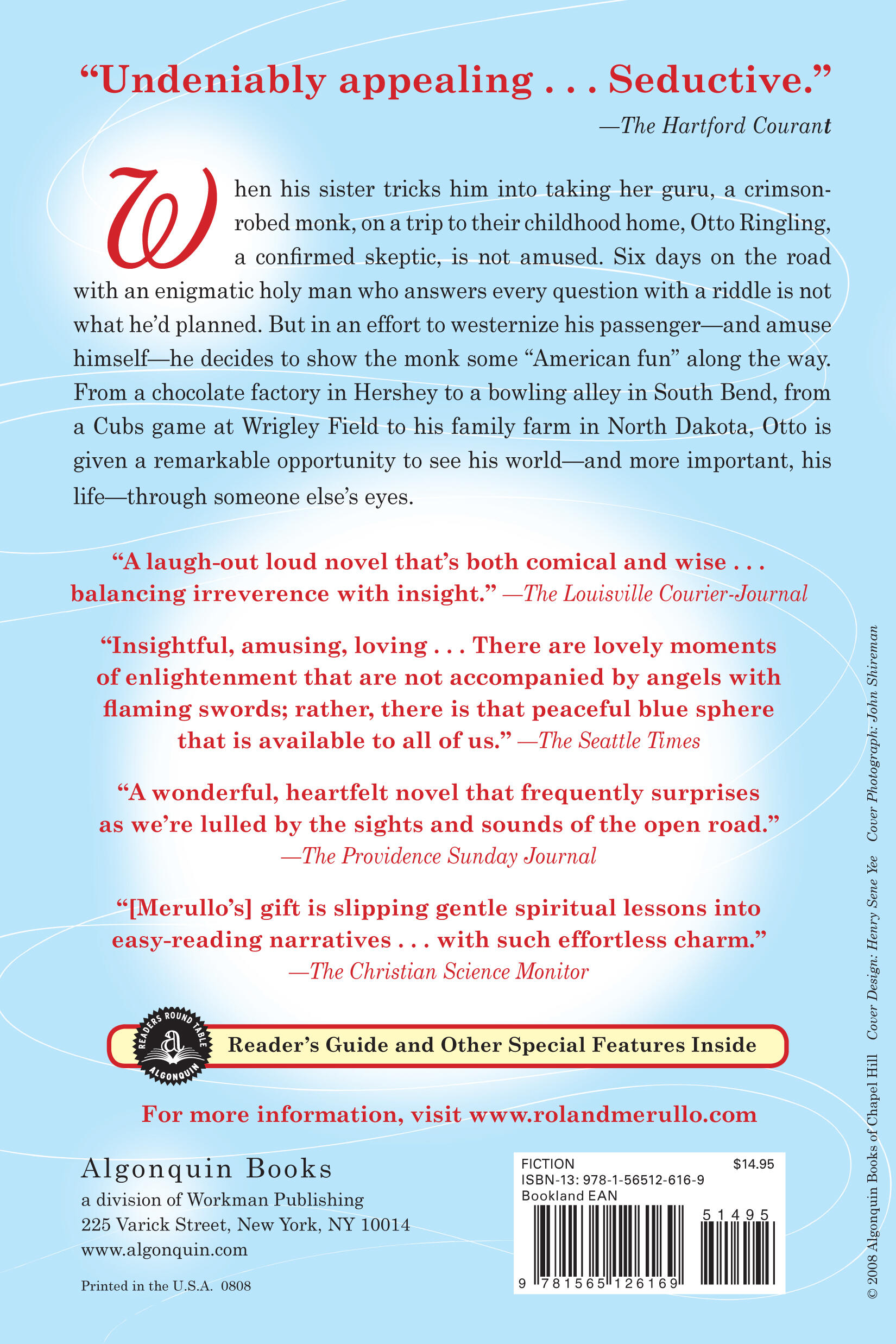 When his sister tricks him into taking her guru on a trip to their childhood home, Otto Ringling, a confirmed skeptic, is not amused. Six days on the road with an enigmatic holy man who answers every question with a riddle is not what he’d planned. But in an effort to westernize his passenger—and amuse himself—he decides to show the monk some “American fun” along the way. From a chocolate factory in Hershey to a bowling alley in South Bend, from a Cubs game at Wrigley field to his family farm near Bismarck, Otto is given the remarkable opportunity to see his world—and more important, his life—through someone else’s eyes. Gradually, skepticism yields to amazement as he realizes that his companion might just be the real thing.