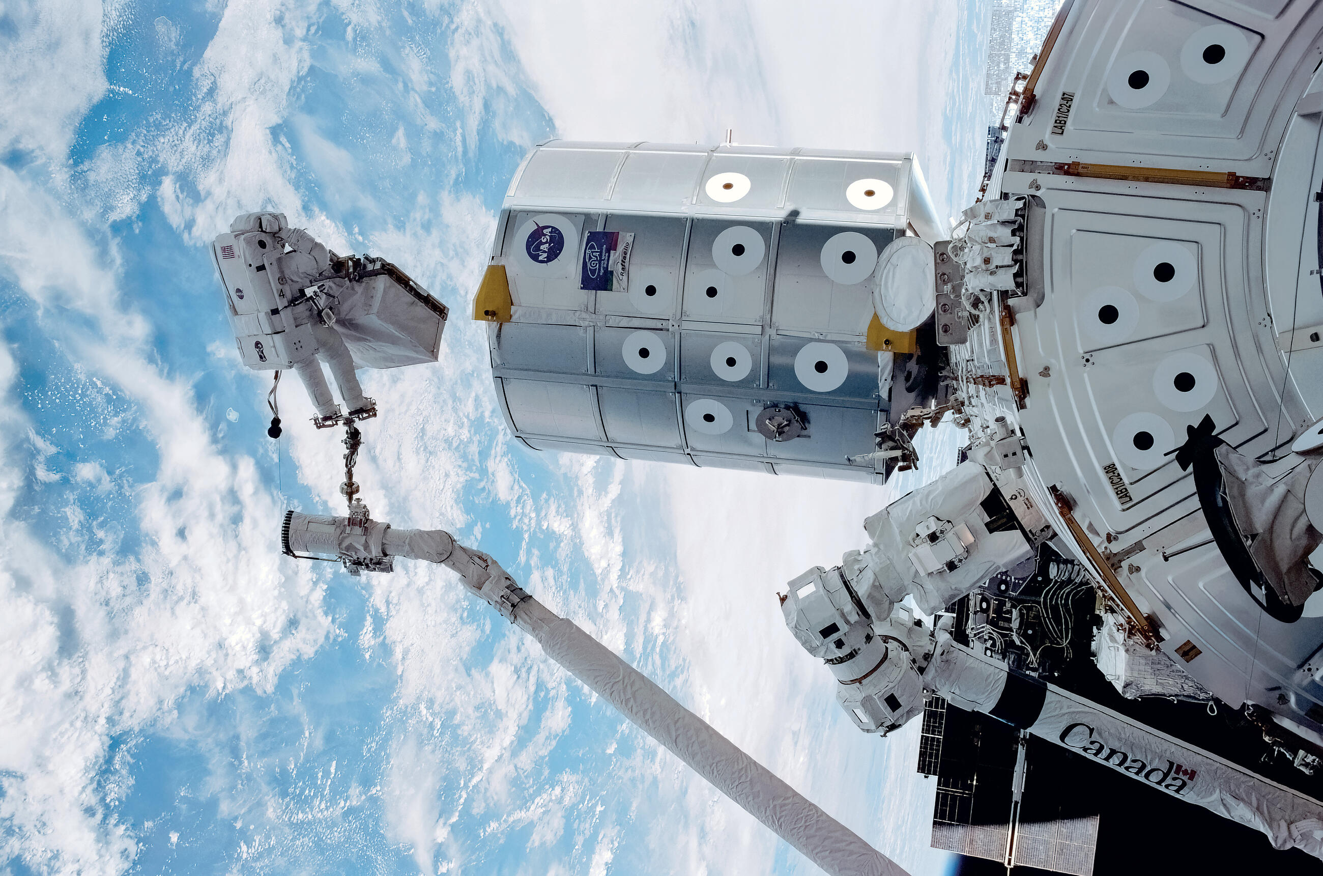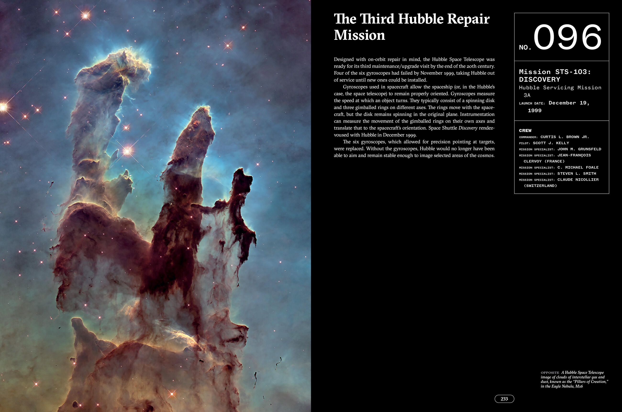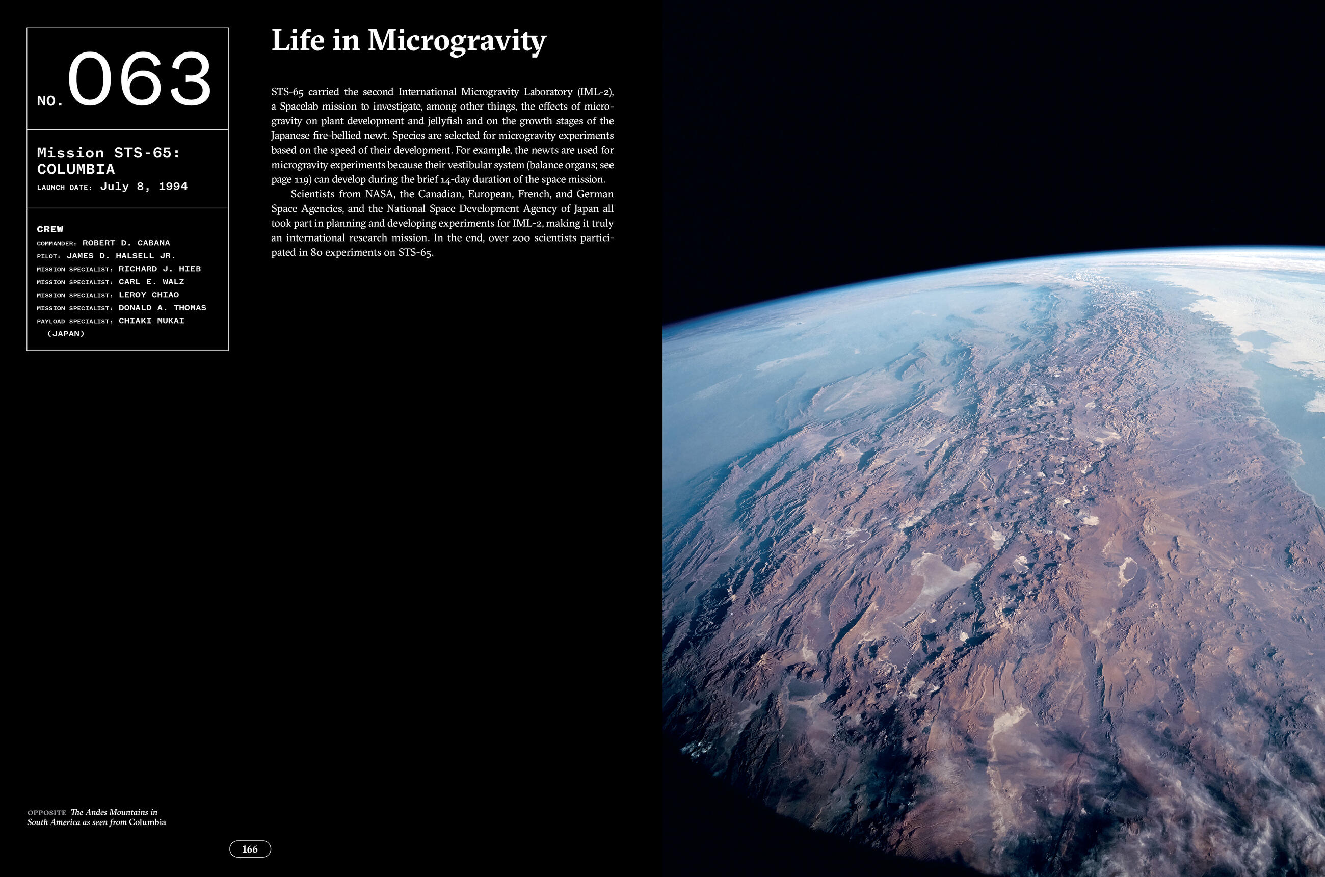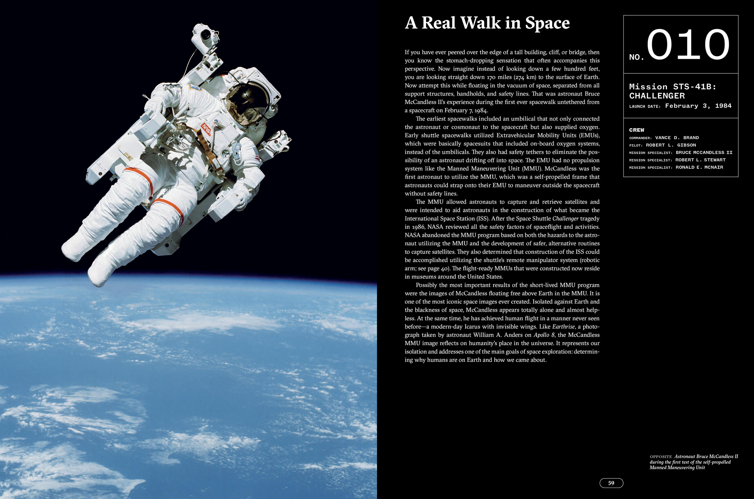 Each mission has its own fascinating story, and The Space Shuttle retells these stories, in chronological order, through incredible photos taken by NASA photojournalists, fine art photographers, and the astronauts themselves. Each image is accompanied by a short text that includes quick facts such as crew members, launch date, and landing date, as well as a short overview of highlights and purpose. For example, STS-78’s mission was to study circadian rhythms in space; STS-41G’s mission was to take photographs in-flight, seen in the IMAX movie The Dream Is Alive; and famously, the first untethered space walk, taken by astronaut Bruce McCandless on STS-41B using a self-propelled backpack unit (called a Man Maneuvering Unit [MMU]), allowed astronauts to capture satellites for retrieval and repair and for the planned construction of what became the International Space Station (ISS). Prior to this mission, astronauts were attached to the shuttle with safety lines. The photo of McCandless floating above Earth’s surface is one of the most celebrated and famous space photographs ever. These are just a few of the 140 stories Miller tells in this beautiful volume.