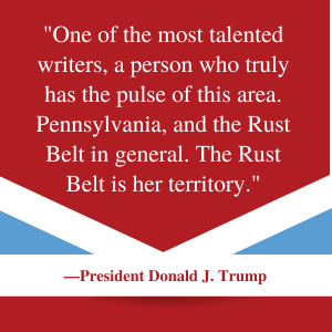 “Salena Zito has written a powerful new Book, BUTLER: The Untold Story of the Near Assassination of Donald Trump and the Fight for America’s Heartland. Salena was an eyewitness to that terrible day, and understands the unbreakable Spirit of our Movement to FIGHT, FIGHT, FIGHT. The Future of our Nation resides in the Hearts and Souls of the People of this Country, and Salena knows we will not rest until we, MAKE AMERICA GREAT AGAIN. Preorder your copy today.”President Donald J. Trump