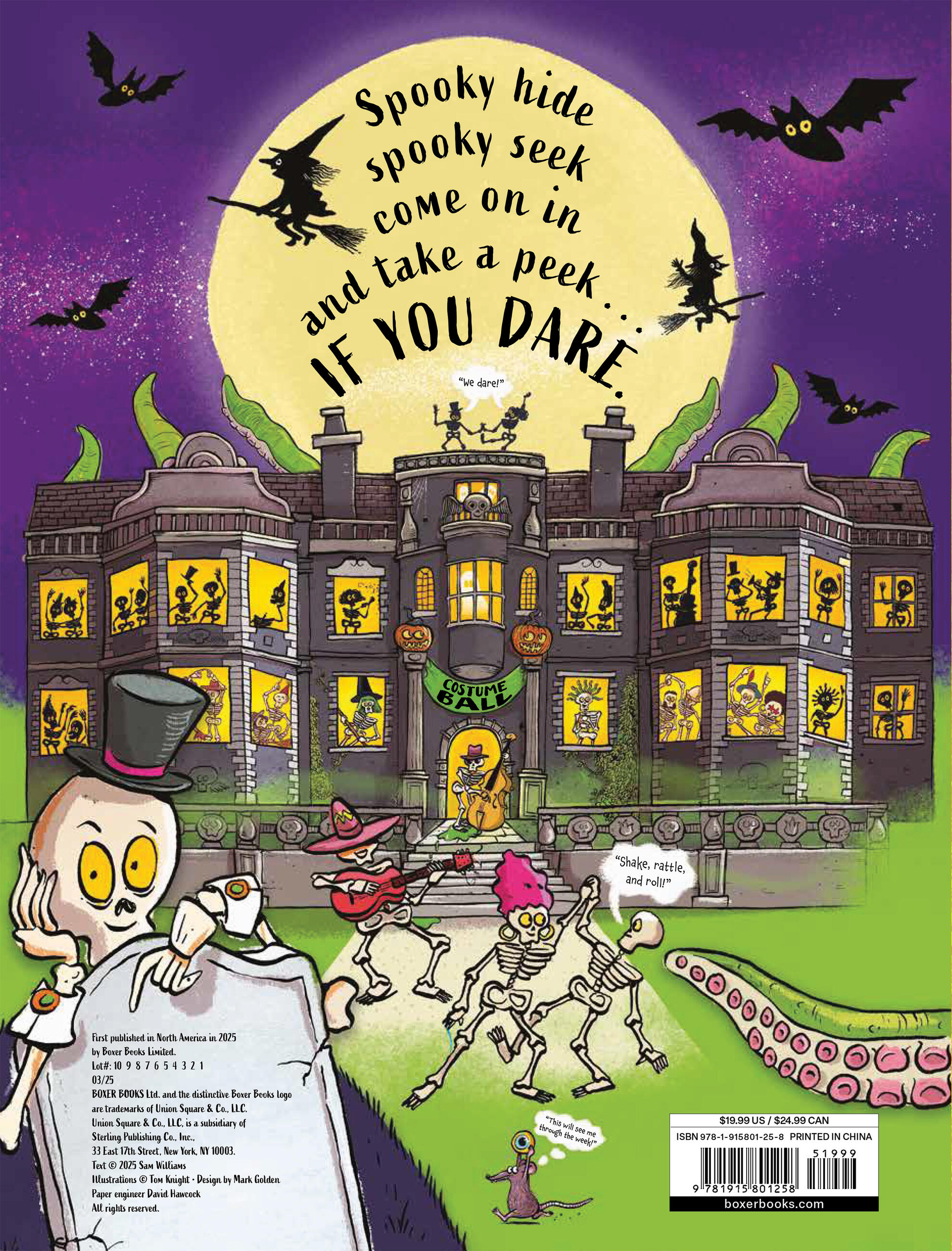 Can you spot the skeletons hiding in closets, treasure chests, and drawers—even the teapot and the cookie jar? But what are the tentacles that creep through doorways and up through the floorboards? Is there a monster hiding in the house? Each spread features multiple pop-up spooky surprises as the skeletons prepare for the party night of the year!