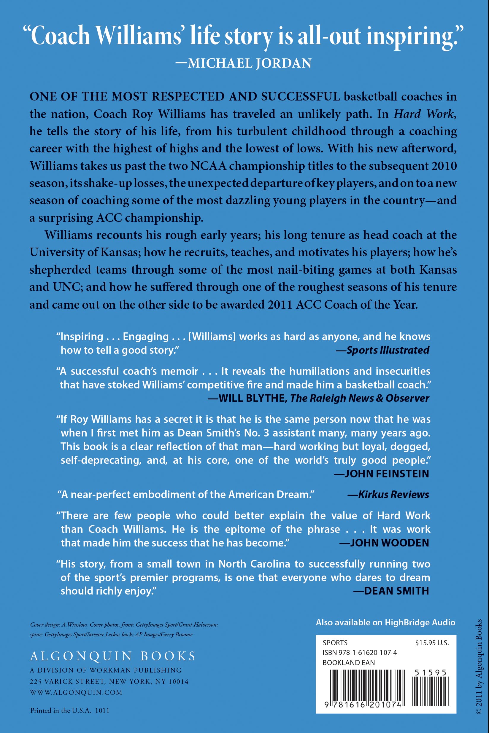And yet, Williams traveled an unlikely path. In Hard Work¸ he tells the story of his life, from his turbulent childhood through a coaching career with the highest of highs and the lowest of lows. Williams recounts his rough early years; his long tenure as head coach at the University of Kansas; how he recruits, teaches, and motivates his players; how he’s shepherded teams through some of the most nail-biting games at both Kansas and UNC; and how he suffered through one of the roughest seasons of his tenure and came out on the other side to be awarded 2011 ACC Coach of the Year.